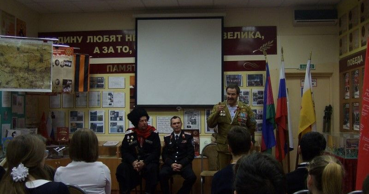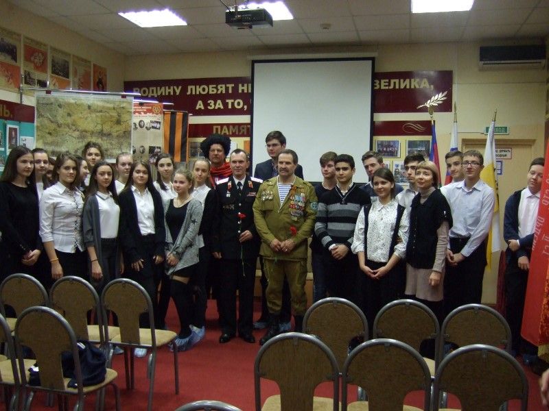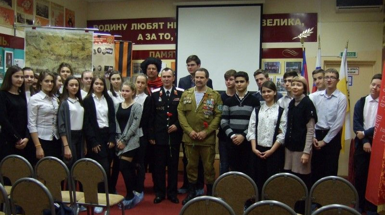 В ходе встречи старшеклассники познакомились с Виктором Александровичем Кирсановым – ведущим специалистом Управления по делам казачества и военнослужащих МО город Краснодар, председателем «Российского союза ветеранов Афганистана» г.Краснодара. Из рассказа Виктора Александровича ребята узнали о значимости участия Ограниченного контингента Советских войск, о непростых условиях прохождения службы в Афганистане. С интересом ознакомились ребята с Памяткой воину - интернационалисту, в которой были отмечены особенности страны Афганистан и определены правила поведения советского солдата с местными жителями на незнакомой территории. Он рассказал о том, что в кубанской столице на сегодняшний день осталось около1100 участников боевых действий в Афганистане: самому «молодому» сегодня уже больше пятидесяти лет.
