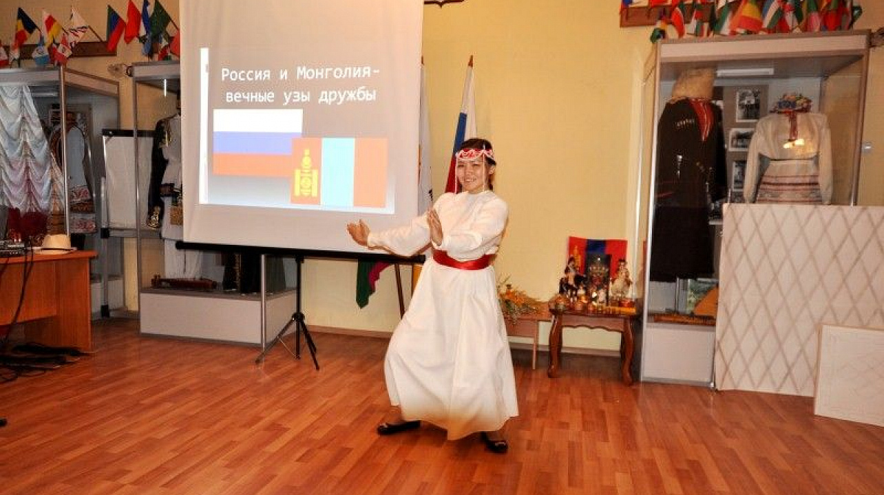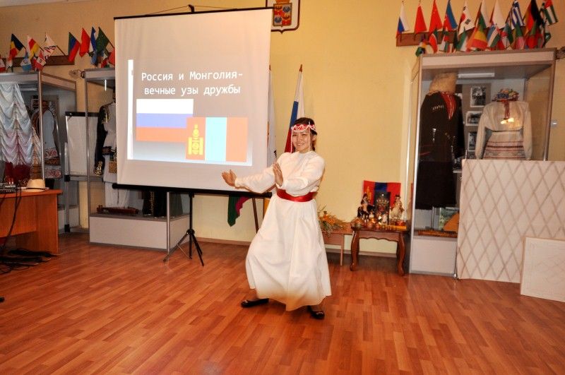 В ответ председатель «Общества русской культуры» Татьяна Евгеньевна Брускова продемонстрировала гостям из далекой Монголии русские национальные костюмы, рассказала о традициях и обычаях русского народа. Подарком для иностранных гостей стало выступление солистки театра-студии «Духовный синтез» Елены Наталенко, которая исполнила популярную народную песню «Субботея».