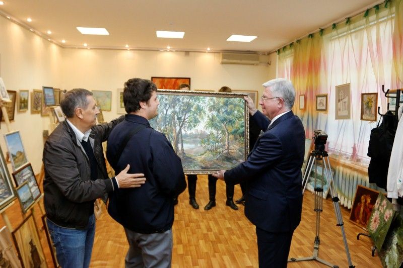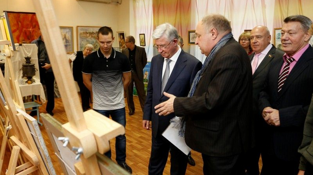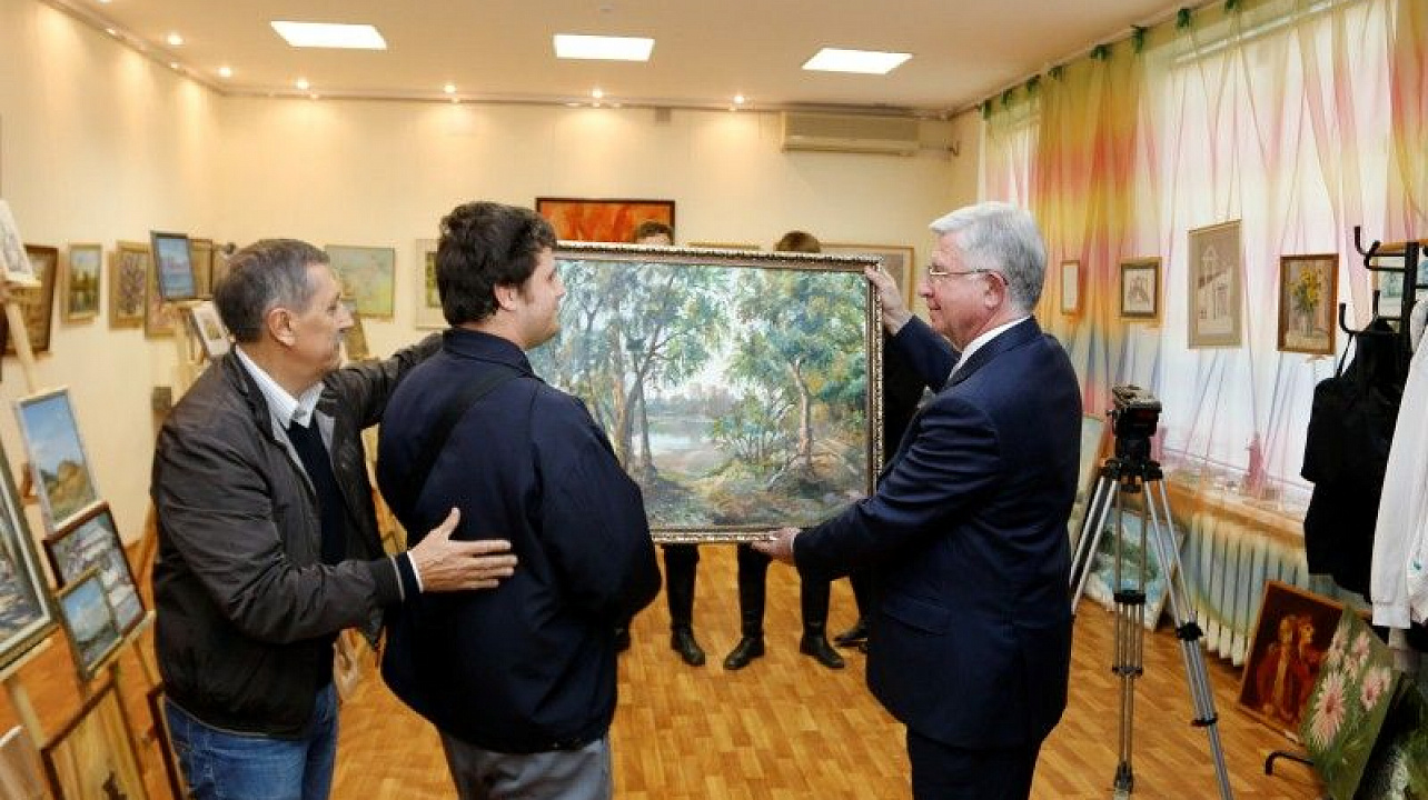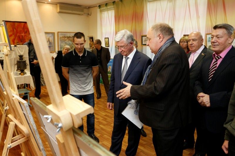Владимир Евланов осмотрел представленные на выставке картины, поговорил с их авторами и вручил двум лучшим воспитанникам «Инва-студии» гранты имени Николая Котлярова, подарил общественным организациям новые книги о Краснодаре.