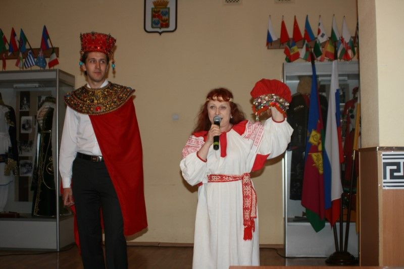 Специально для этого мероприятия председатель Краснодарской краевой общественной организации «Общество русской культуры» Татьяна Евгеньевна Брускова подготовила рассказ об истории народных костюмов, значении орнаментов, сделав особый акцент на родственности русской и греческой культур.