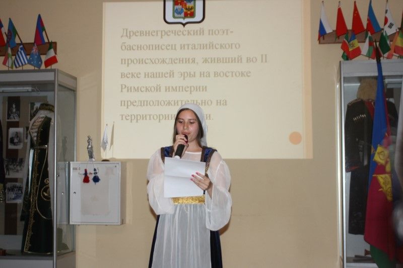 Программа гостиной включала в себя как творческую часть, так и несколько познавательных блоков: «Греция. Наследие древней культуры», «Греческая мифология», «Греки на Кубани». Присутствующие смогли поучаствовать в викторине «Знаменитые греки», победители которой получили памятные сувениры.