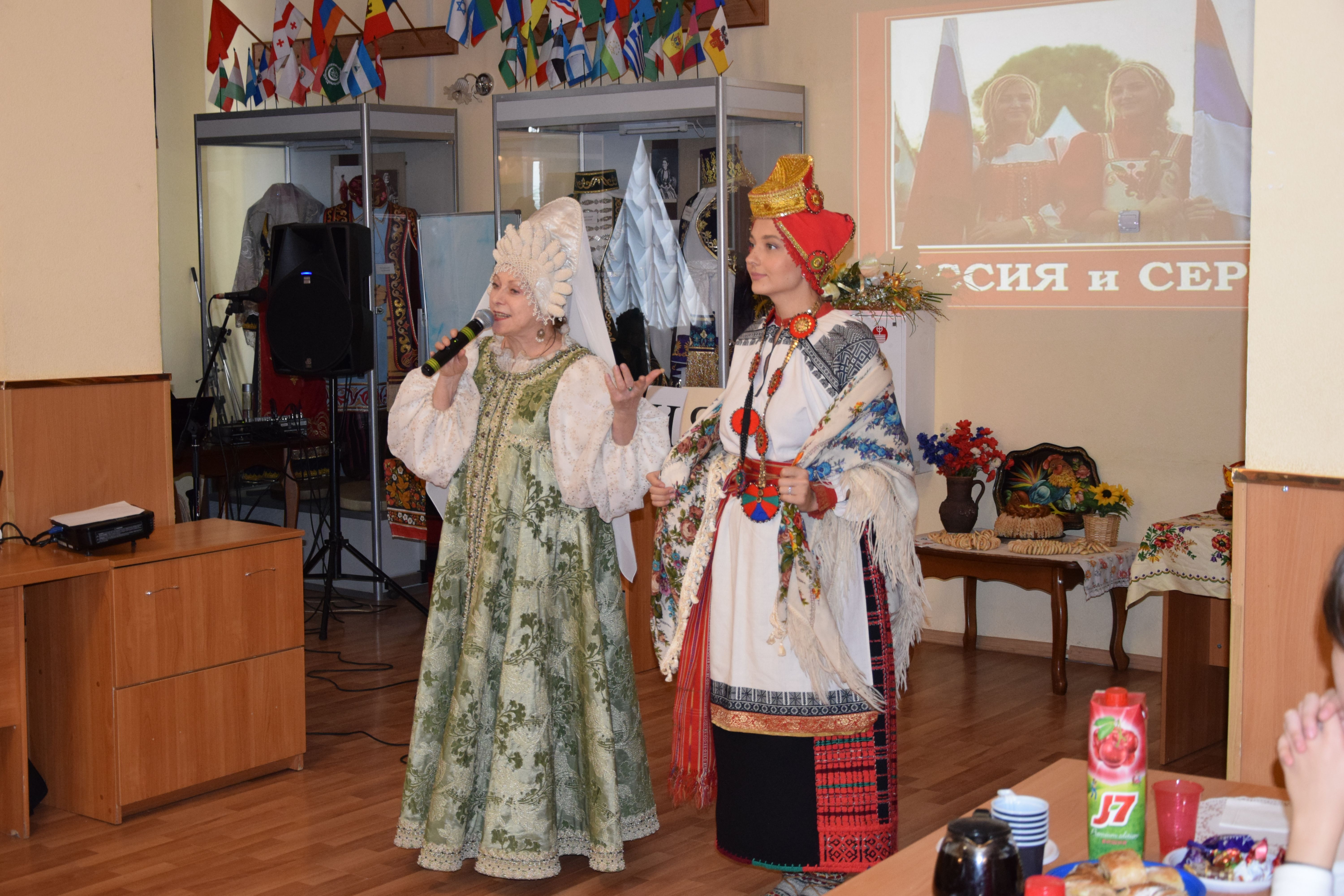 Творческую программу вечера открыла председатель молодёжного клуба «Оберег» Алёна Шубина с лирической песней «Моя Россия». В продолжение мероприятия Татьяна Брускова провела интерактивную игру с гостями, рассказала о традициях русской свадьбы, о русском и сербском национальных костюмах, подчеркнув общность славянских символов, узоров и орнаментов, а солисты возглавляемого ею театра-студии «Духовный синтез» исполнили русские традиционные обрядовые песни.