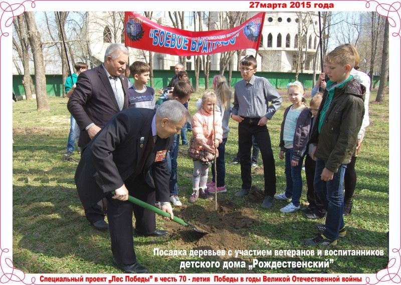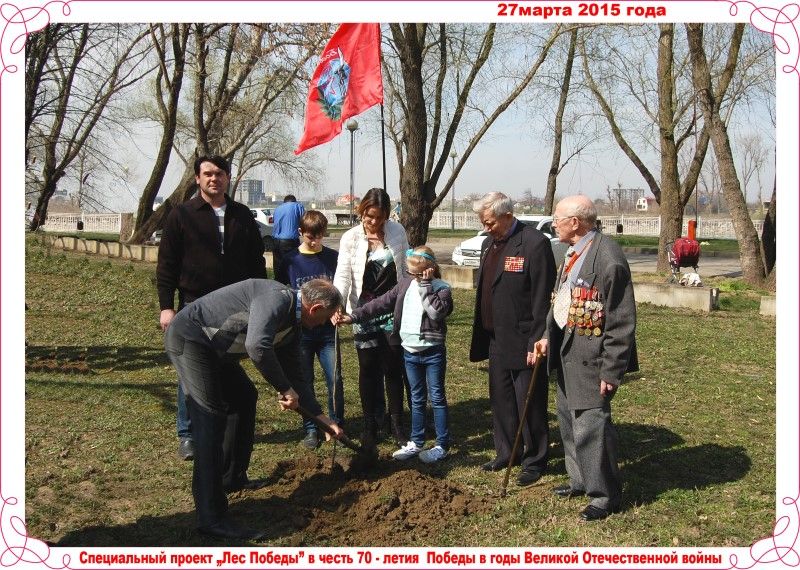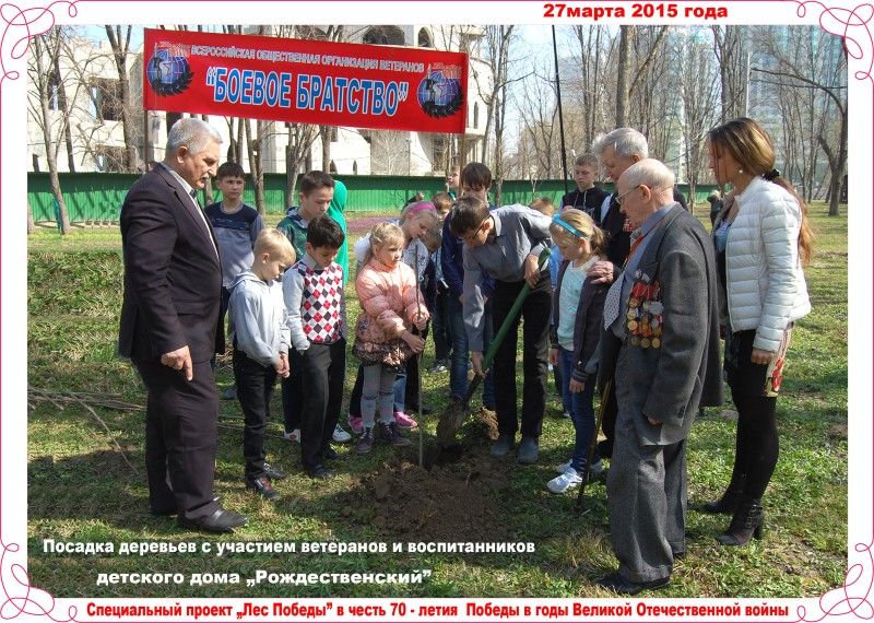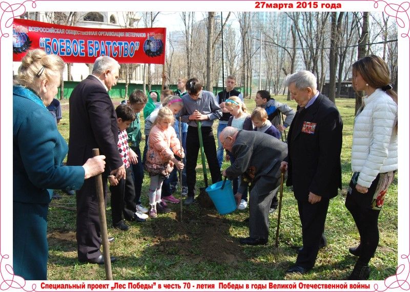 Краснодарское городское отделение организации ветеранов «Боевое братство» совместно с муниципальным казённым учреждением «Центр патриотического воспитания молодёжи» 27 марта в парке им. 30-летия Победы приняли участие в акции «Лес Победы». Участники акции – ветераны, молодежь, воспитанники детского дома «Рождественский», высаживали деревья (клёны) на территории парка, рядом с Выставочным залом Боевой славы. Всего в акции приняло участие 55 человек.