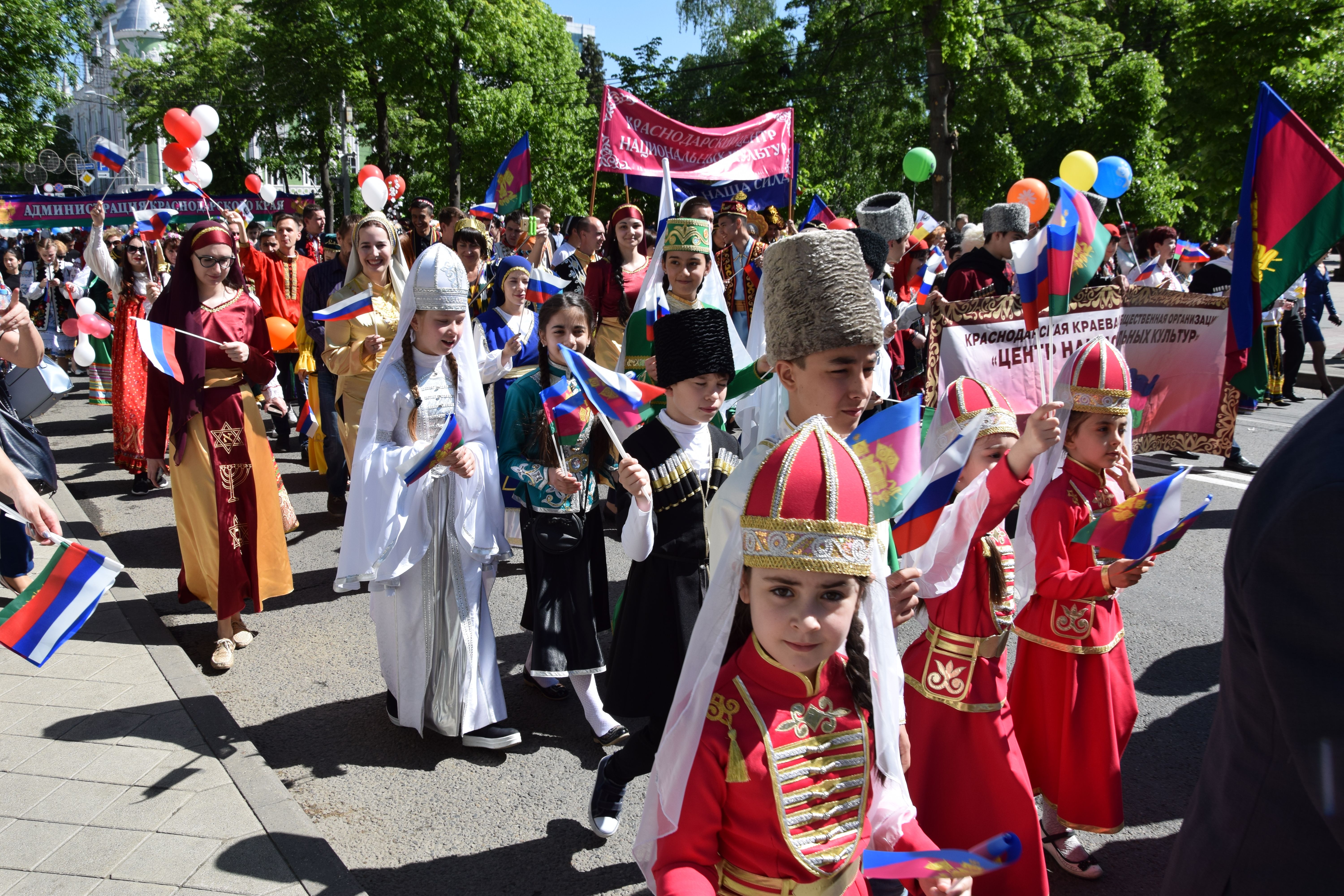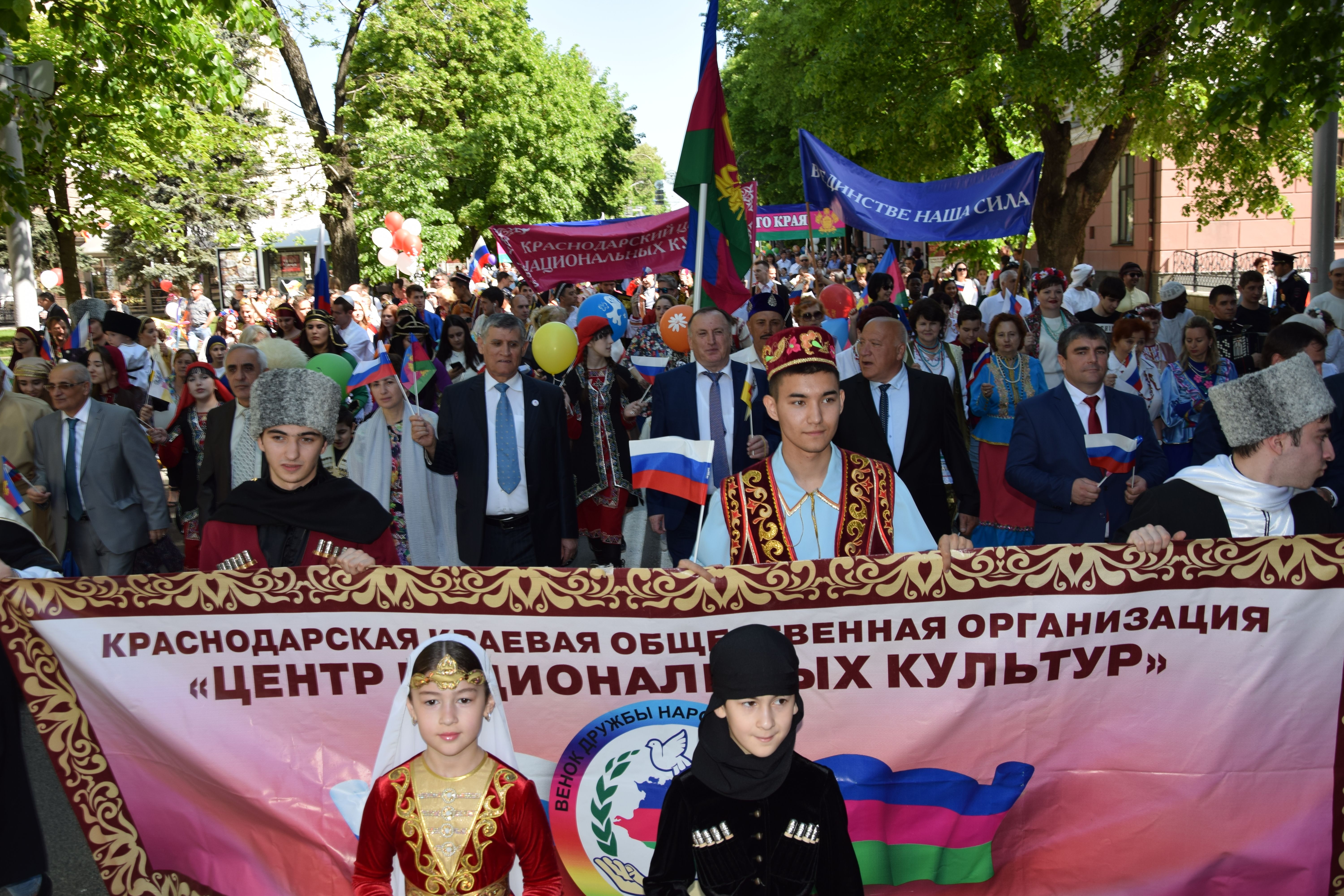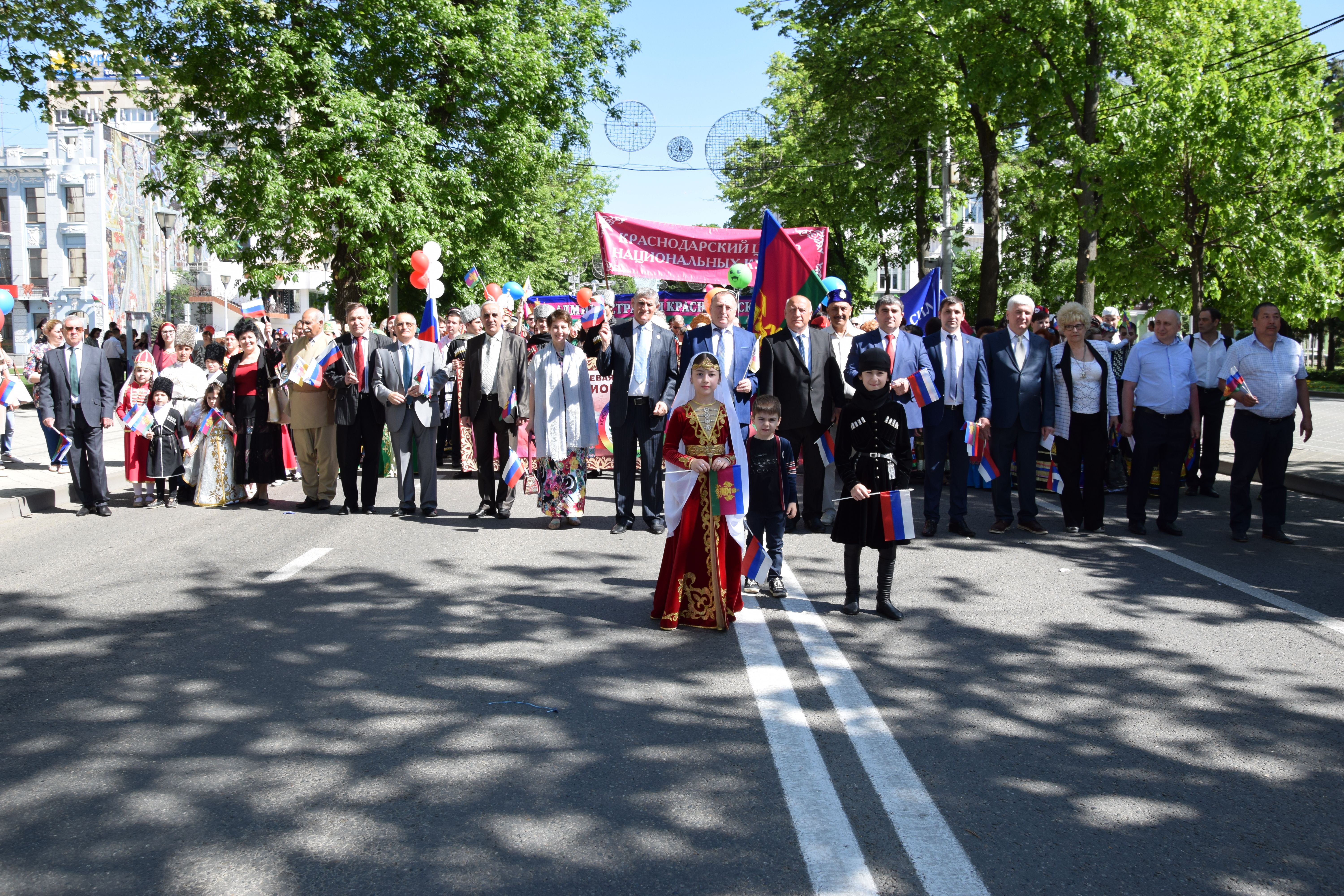 Вместе с сотрудниками краевой и городской администраций, работниками учреждений образования, здравоохранения, культуры, сферы социального обслуживания населения, жилищно-коммунального хозяйства, транспортной и дорожной отрасли, агропромышленного комплекса, школьниками и студентами, спортсменами, представителями общественных организаций, профсоюзов, казачества, участниками праздничного шествия стали и около 300 активистов Краснодарской краевой общественной организации «Центр национальных культур», многие из которых пришли на праздник в своих национальных костюмах.
