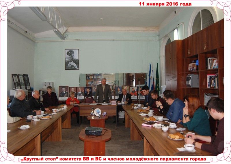 15 января 2016Актив Краснодарской городской общественной организации ветеранов (пенсионеров, инвалидов) войны, труда, Вооруженных Сил и правоохранительных органов провёл «Круглый стол» с членами молодёжного парламента города, в котором приняли участие председатели комитетов организации и председатели комиссий по патриотическому воспитанию окружных Советов ветеранов. В ходе оживлённой дискуссии были выработаны основные направления по взаимодействию ветеранской организации и учащейся молодёжи Краснодара. Основной акцент был сделан на разработку плана патриотической работы в период месячника оборонно – массовой и военно – патриотической работы под девизом: «Я помню – я горжусь!», а также в период подготовки к 73-ей годовщине освобождения города Краснодара от немецко – фашистских захватчиков и 71-ой годовщине Победы над фашистской Германией. Были рассмотрены вопросы создания совместных пропагандистских групп для работы в средних общеобразовательных школах, средних учебных заведениях и ВУЗах, определена тематика для выступлений. Намечены совместные мероприятия патриотической направленности с учётом дней воинской славы и памятных дат России и Краснодара. Рассмотрены вопросы участия представителей парламента в работе комитетов главной ветеранской организации города, и наоборот, участие ветеранов в работе парламента с целью поддержания связи поколений, обмена опытом работы.