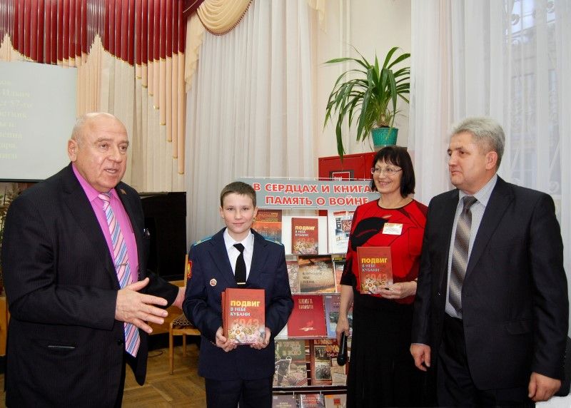 Подарочные экземпляры книги «Краснодар в годы Великой Отечественной войны» и книги Героя Советского Союза, лётчика, почётного гражданина города Краснодара, генерал – майора в отставке, участника Великой Отечественной войны Николая Павловича Жугана «Подвиг в небе Кубани» были переданы в библиотеки города и юному кадету для библиотеки училища.