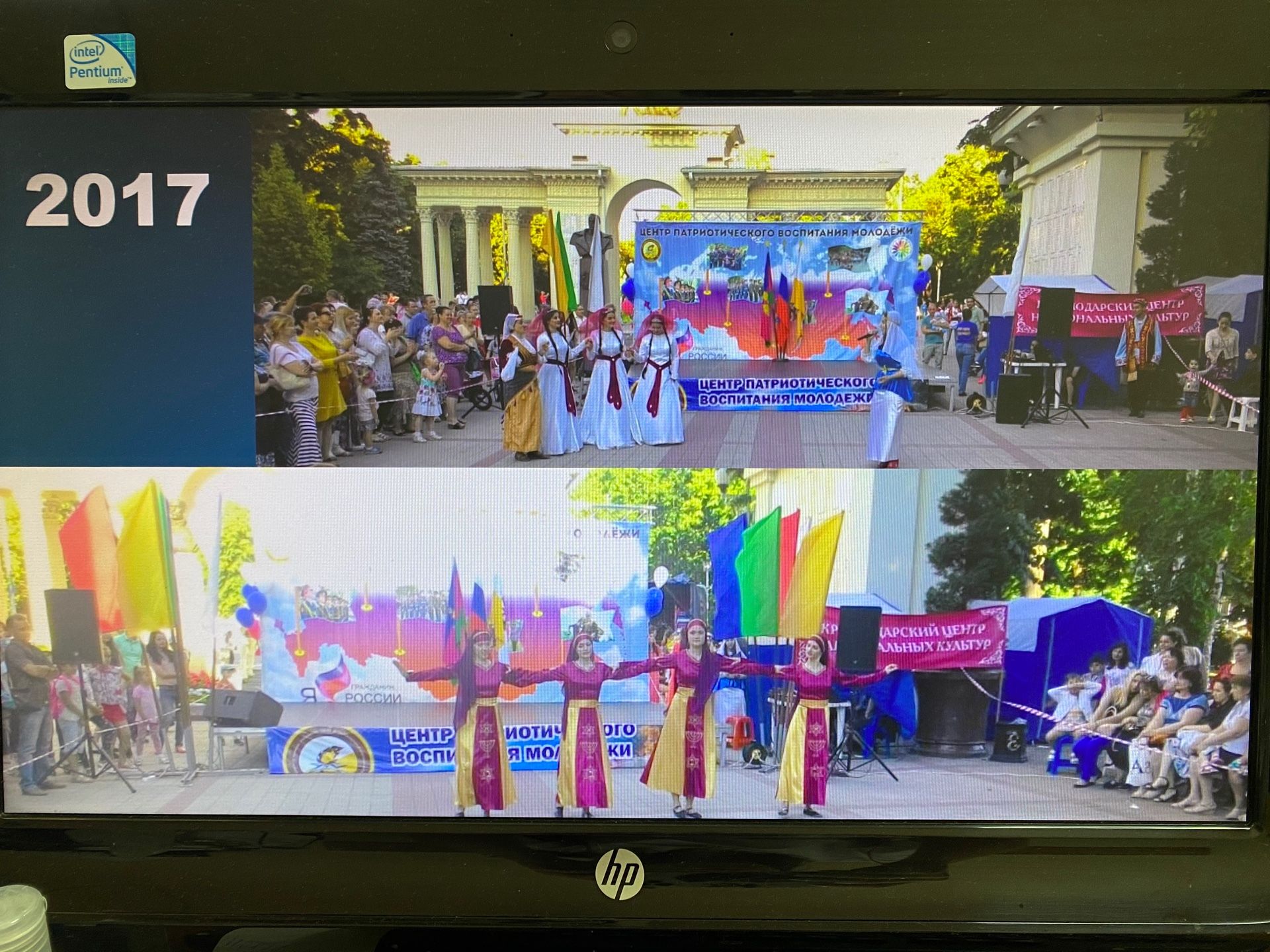 В завершение встречи сотрудниками Общественно-информационного центра города Краснодара была представлена фото-презентация «День России в Краснодаре». На экране, сменяя друг друга, появлялись яркие фотографии с празднования Дня России прошлых лет. Артисты в национальных костюмах, шествия по улице Красной, запечатлённые на фотоснимках моменты выступлений – всё это создало атмосферу праздника и единства народов многонационального Краснодара.