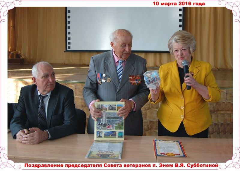 В.Я. Субботина передала в дар Совету ветеранов Центрального округа города Краснодара подарочный экземпляр книги, изданный к 90 – летию Тахтамукайского района и памятную кружку с эмблемой посёлка Энем.