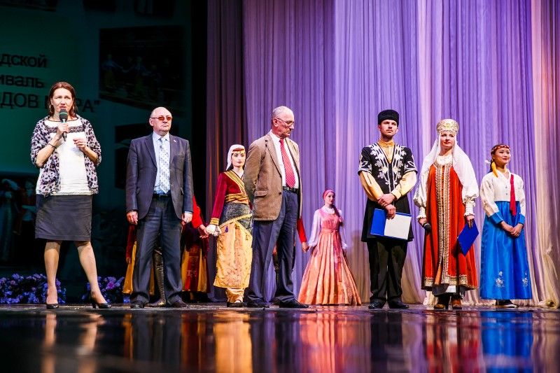 В завершение Краснодарского городского молодёжного фестиваля «Песни и танцы народов мира» все участники праздника яркой интернациональной мозаикой собрались на сцене, где состоялась торжественная церемония вручения дипломов и памятных подарков.
