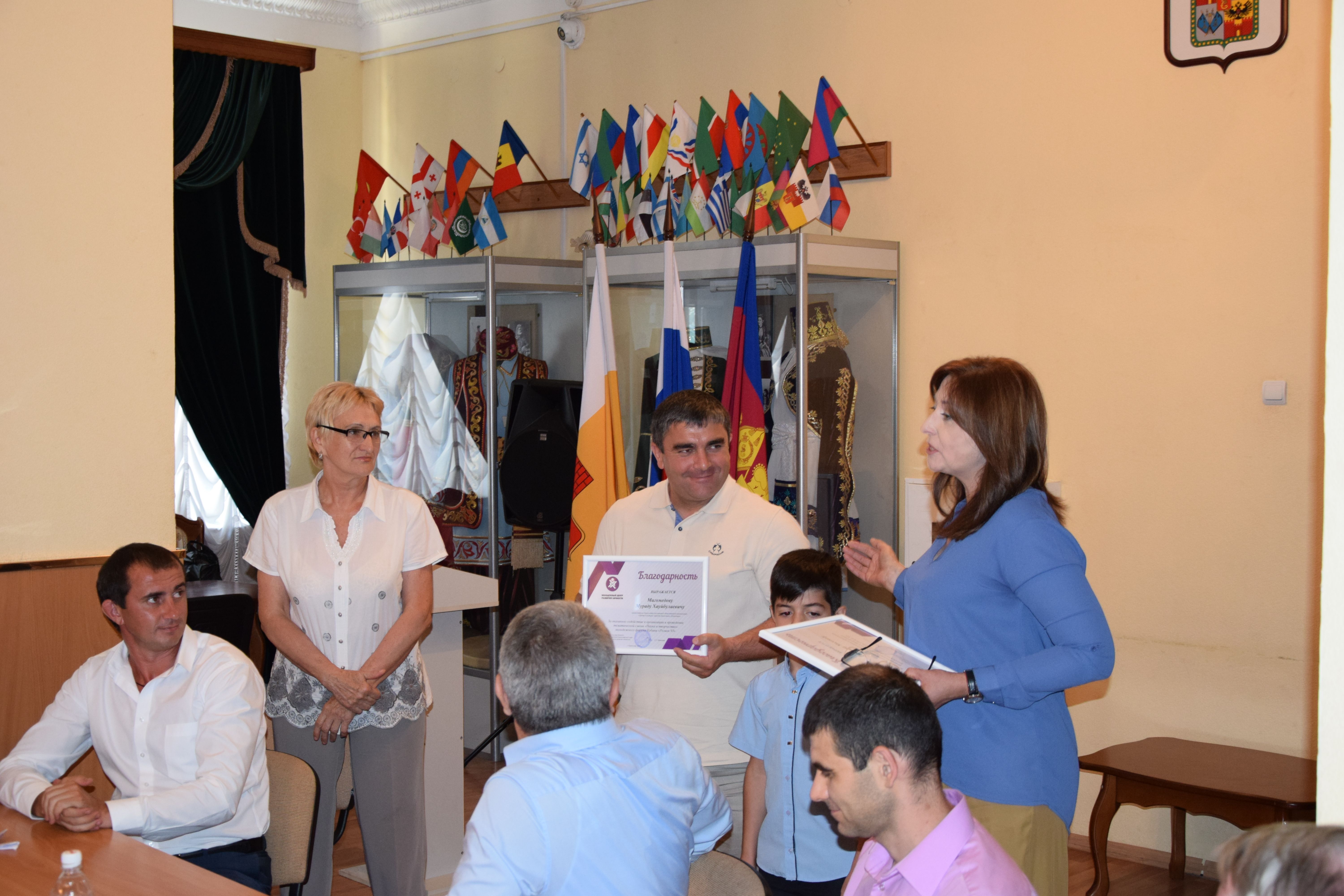 Подтверждением этих слов стало вручение присутствовавшим на встрече руководителем Государственного казенного учреждения Краснодарского края «Молодежный центр развития личности» С.Г.Маноновой именных благодарностей председателю ККОО «Центр культуры народов Дагестана «Единство» Мураду Магомедову и активисту организации Магомеду Диядилову. Представители дагестанской организации были награждены за оказание содействия в проведении 2 августа 2018 года тематических площадок «Создание и функционирование КИД (клуб интернациональной дружбы)» и «Дом ста народов» смены «Наука и творчество» молодёжного форума Кубани «Регион 93». Руководитель Молодежного центра развития личности отметила, что проведённые в рамках смены мастер-классы «Кавказский танец» не оставили никого равнодушным и пожелала награждаемым дальнейших успехов, непрерывного саморазвития, новых побед и свершений!