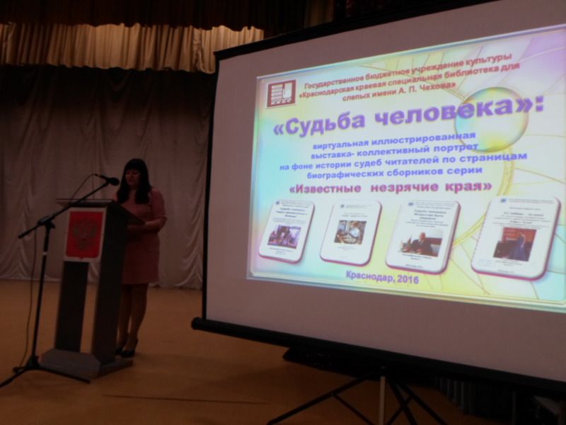 Краснодарская ММО ВОС и сотрудники ЦСПИ и литературной гостиной отдела делового и досугового чтения Краснодарской краевой специальной библиотеки для слепых имени А. П. Чехова провели мультимедийную презентацию виртуальной выставки-коллективного портрета «Судьба человека»: по страницам библиографических сборников серии «Известные незрячие края» в Концертном зале Дома культуры Всероссийского общества слепых (ВОС).