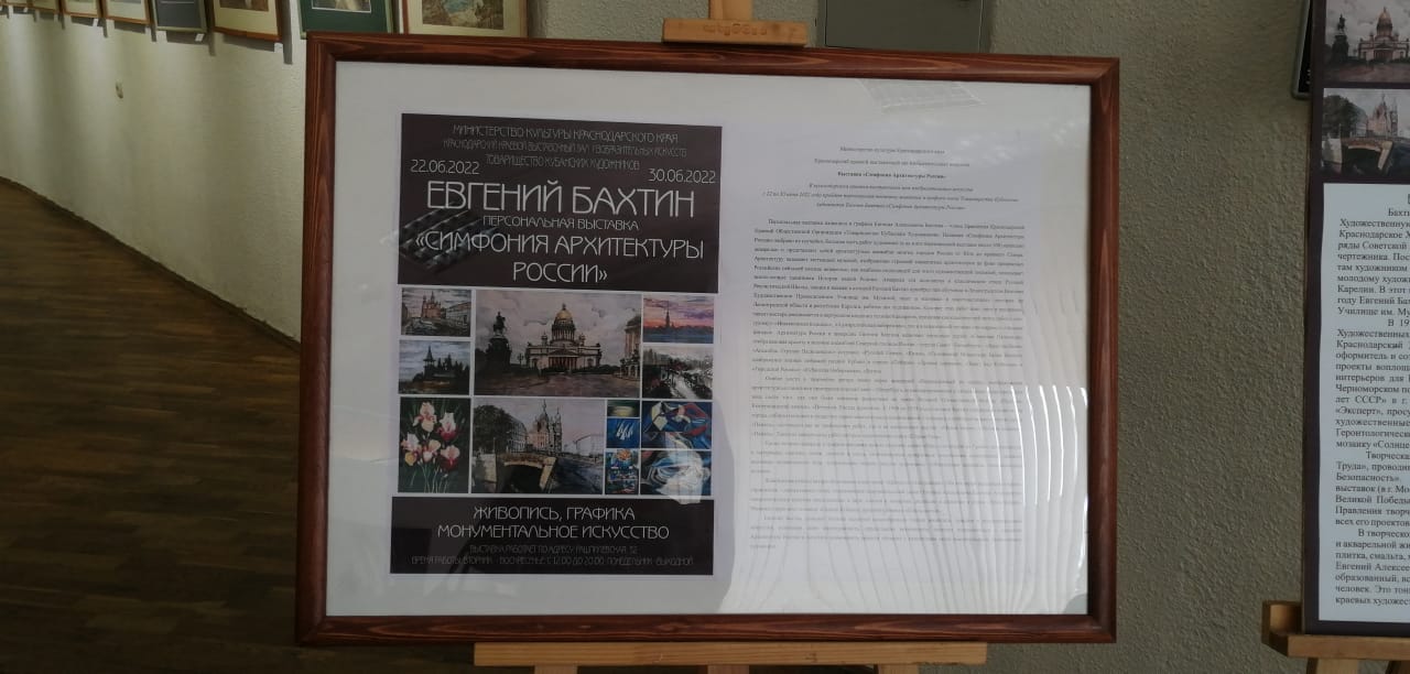 5 июля 2022В Краснодарском краевом выставочном зале изобразительных искусств состоялась персональная выставка живописи и графики члена «Товарищества Кубанских художников», председателя ТОС № 33 Евгения Бахтина.