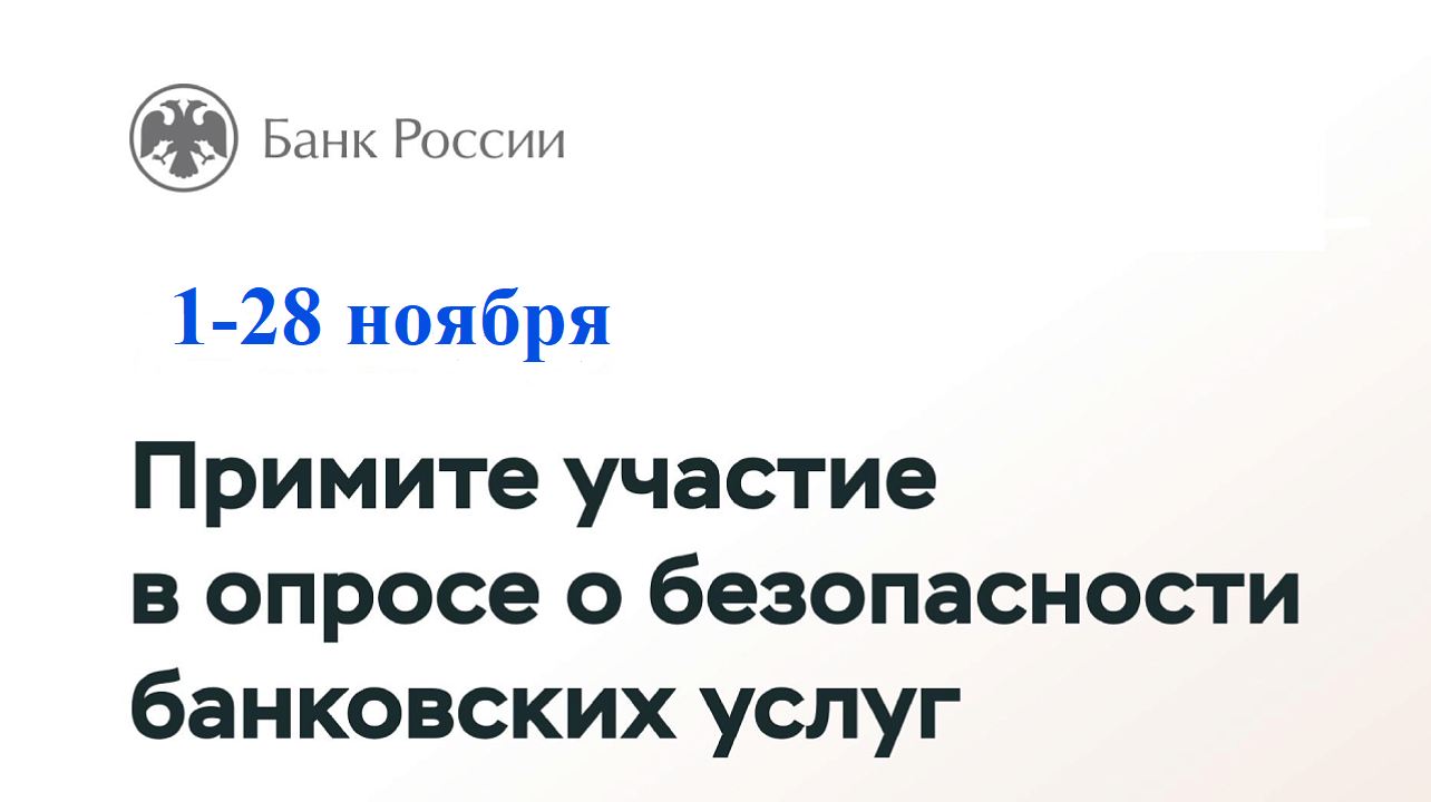 В целях профилактики хищений средств клиентов финансовых организаций — жителей Кубани, Банк России с 1 по 28 ноября 2025 года проводит опрос жителей региона на тему: «Степень удовлетворенности населения уровнем безопасности финансовых услуг, оказываемых организациями