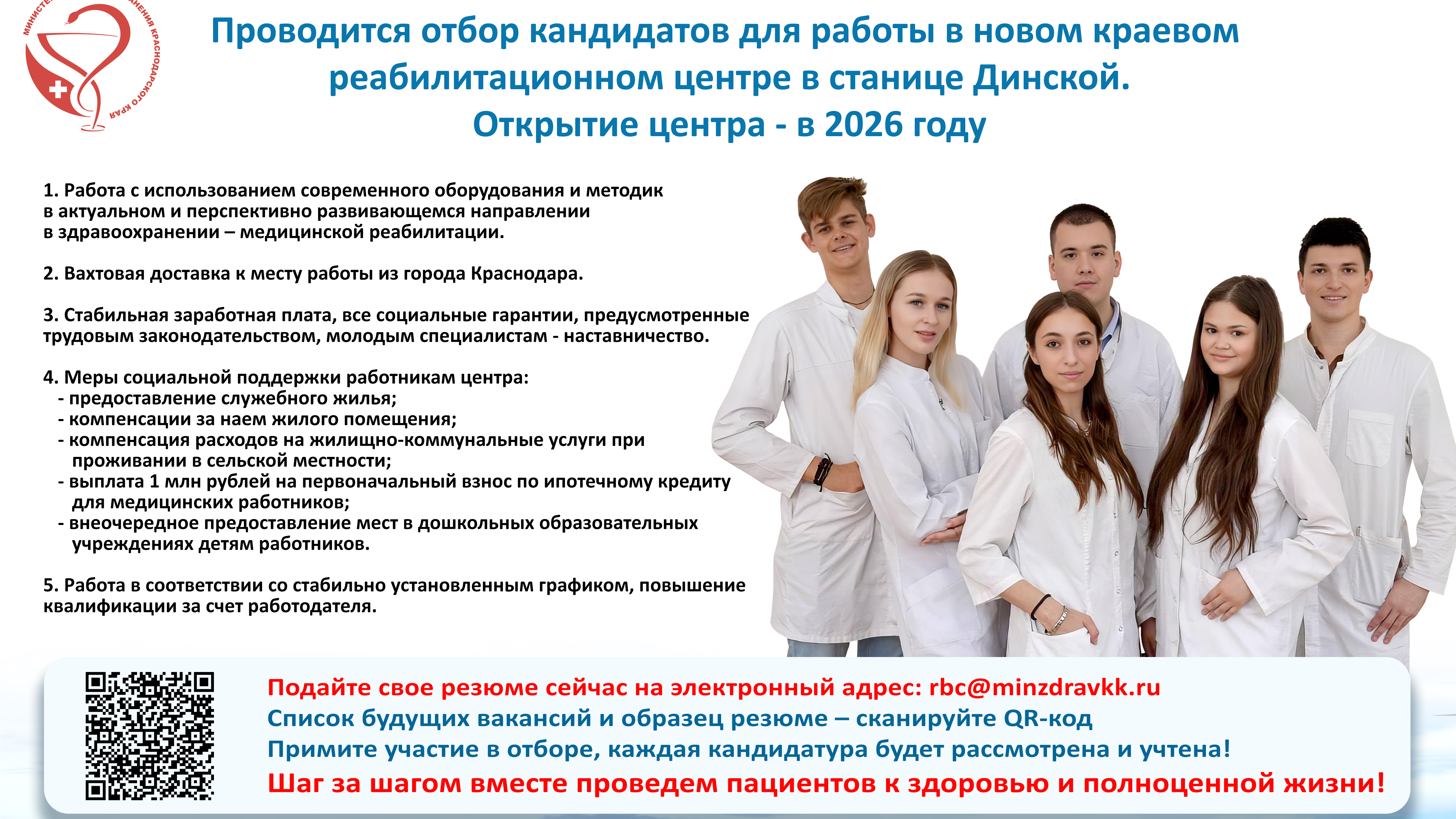 7 июля 2025Работа в перспективно развивающемся направлении в здравоохранении — медицинской реабилитации, стабильная заработная плата, все социальные гарантии, меры социальной поддержки и вахтовая доставка к месту работы из г. Краснодара.