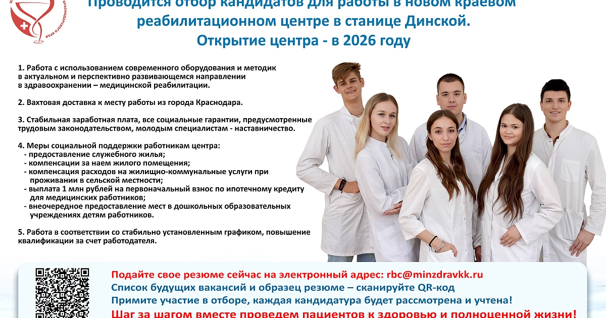 Проводится отбор кандидатов для работы в новом краевом реабилитационном центре, расположенном в станице Динской. Открытие центра – в 2026 году