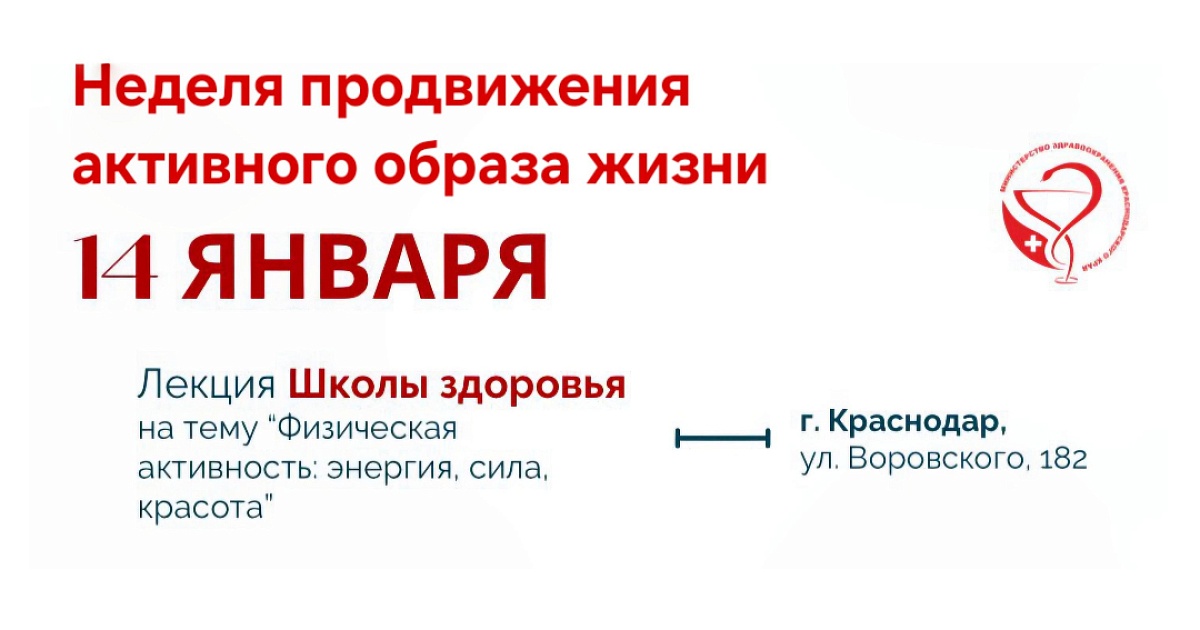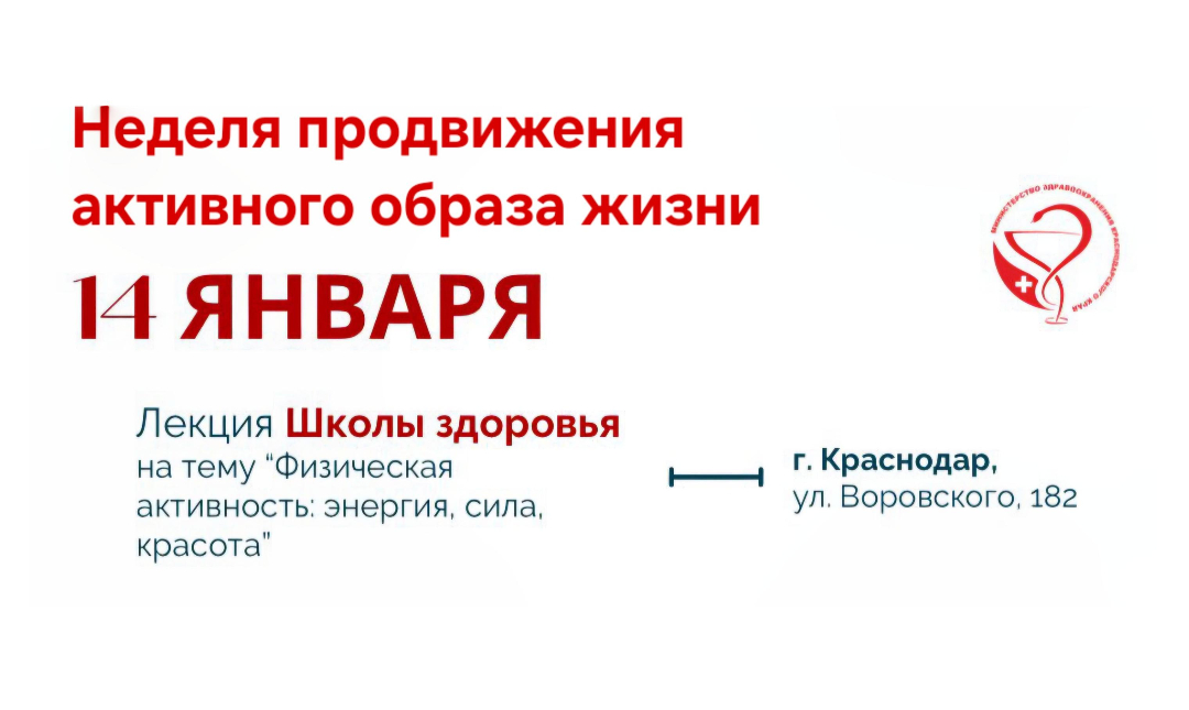 13 января 2026В рамках мероприятий, организованных Министерством здравоохранения Краснодарского края, приуроченных к Неделе продвижения активного образа жизни, всем заинтересованным лицам предлагается посетить лекцию на тему «Физическая активность: энергия, сила, красота». Лекция состоится 14 января в ГБУЗ «Центр общественного здоровья и медицинской профилактики» Министерства здравоохранения Краснодарского края по адресу: г. Краснодар, ул. Воровского, 182.