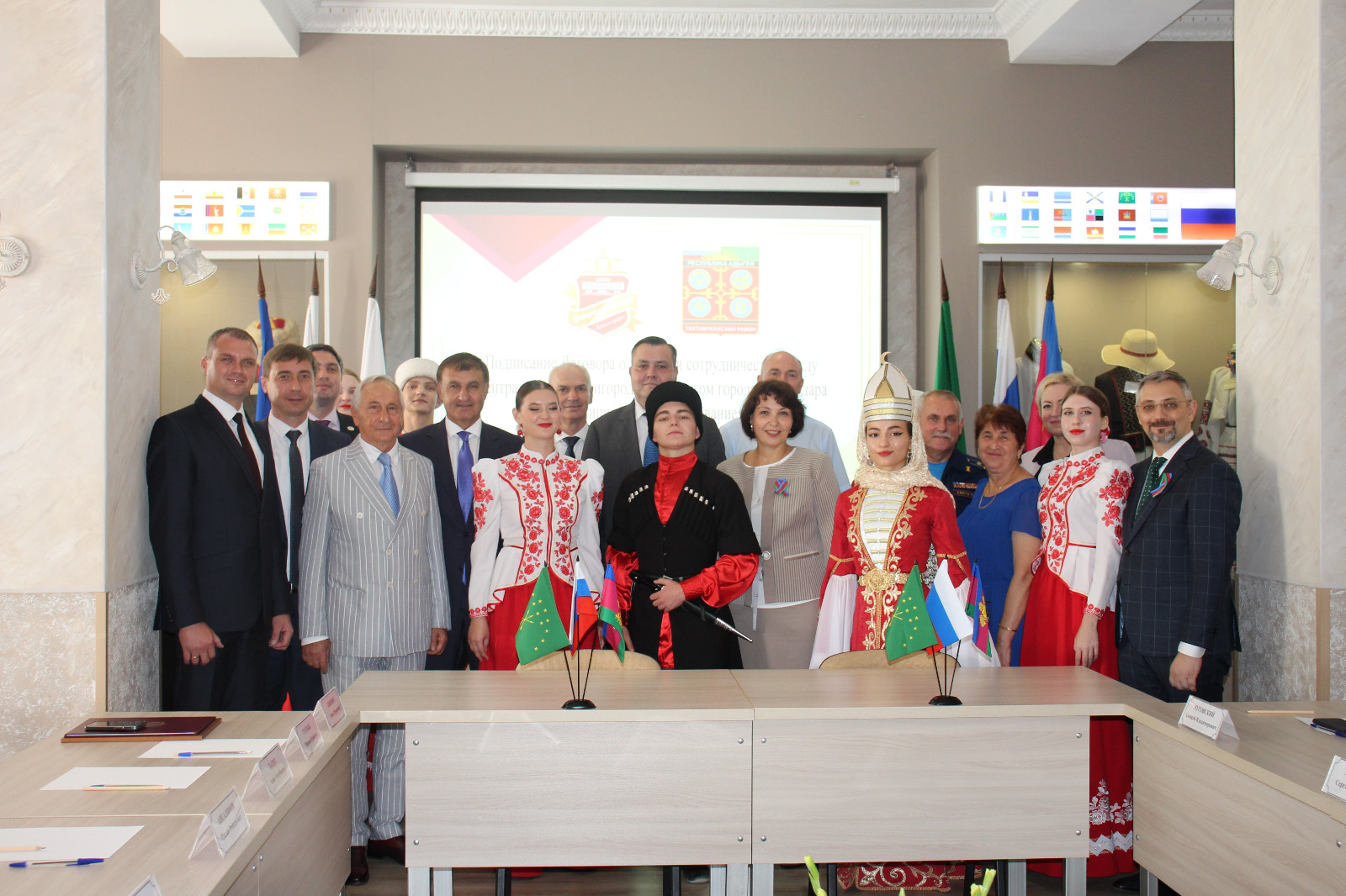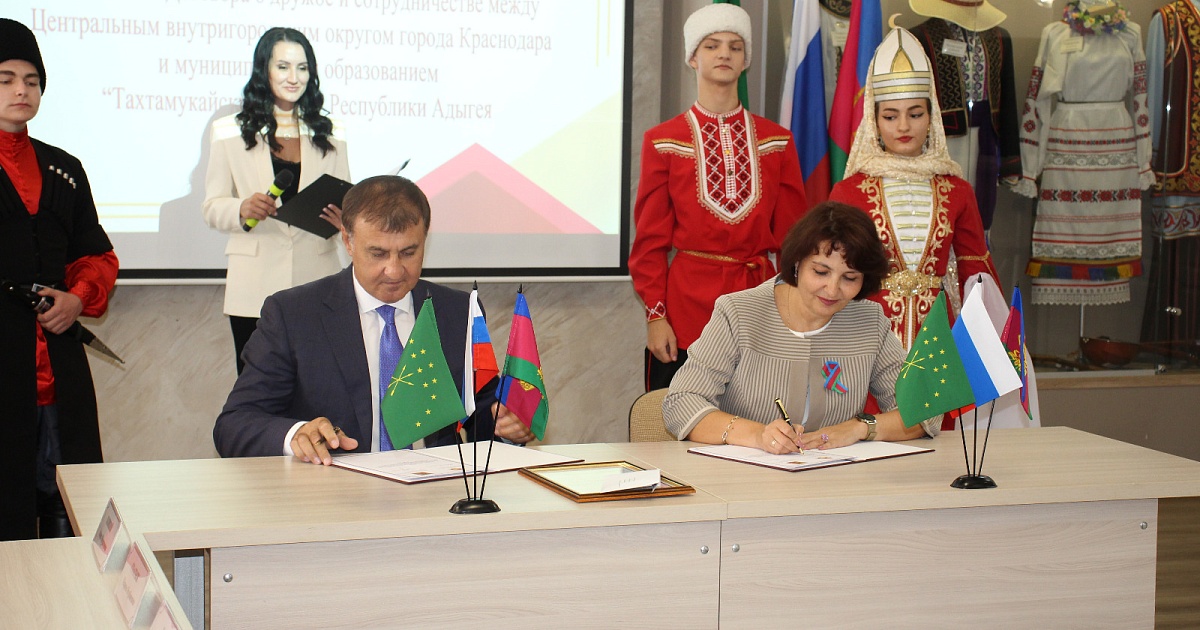 13 сентября 2024 года в национальной гостиной «Центра национальных культур» состоялась церемония письменного подтверждения дружбы и сотрудничества между Центральным внутригородским округом города Краснодара и муниципальным образованием «Тахтамукайский район» Республики Адыгея, в которой приняли участие глава администрации Центрального внутригородского округа города Краснодара Елена Малова, глава муниципального образования «Тахтамукайский район» Республики Адыгея Савв Аскер Хаджумарович, депутат Законодательного Собрания Краснодарского края Андрей Дорошев, начальник отдела зарубежных связей и межмуниципального сотрудничества администрации муниципального образования город Краснодар Алексей Луговский и другие представители двух администраций.