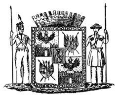 Исторический герб Екатеринодара, утвержден 14 сентября 1849 года. Описание герба: "Щит разделен крестообразно на четыре равные части: в первой и четвертой, в золотом поле, крепость червленого цвета, над оной черный двуглавый орел, имеющий на груди Московский герб; во второй и третьей частях, в серебряном поле, по два, накрест положенные, знамени лазуревого цвета с вензелями: императрицы Екатерины II, императоров: Павла I, Александра I и Николая I; между знамен Атаманская булава, а по сторонам ее два бунчука. Посередине щита помещен малый червленный щит, на котором вензель императрицы Екатерины II и 1794 год. Над щитом золотая городская корона. Щит поддерживают два Черноморские казака: с правой стороны - одетый в прежнюю форму, а с левой стороны - в настоящей форме. Герб окружен зеленой каймою, на коей 59 золотых звезд, показывающих число казачьих станиц в Черноморском войске".