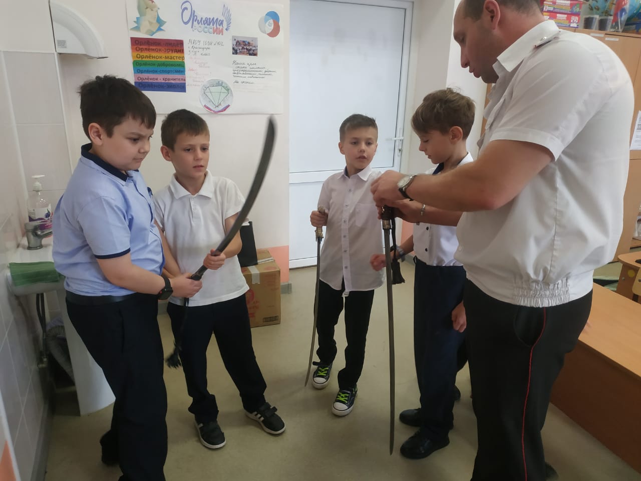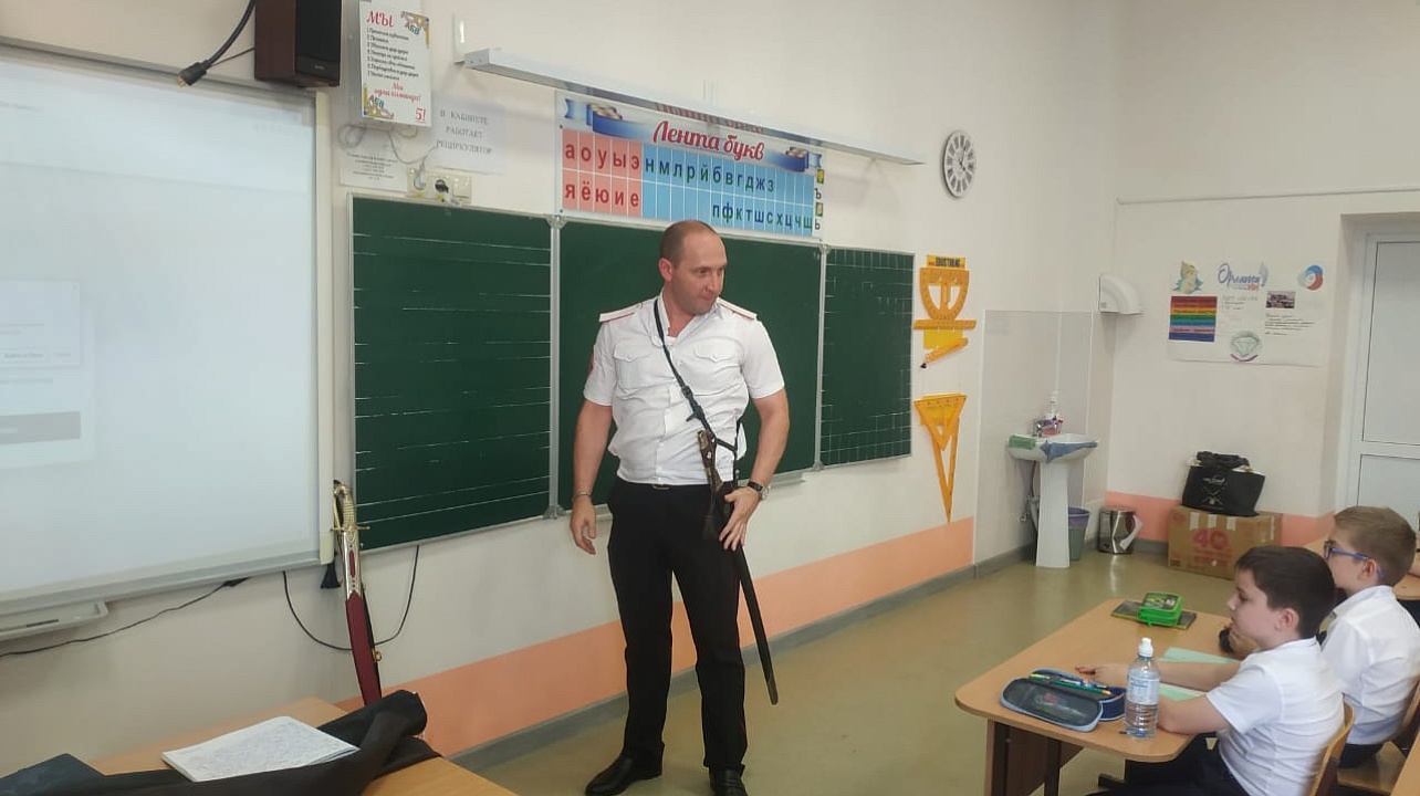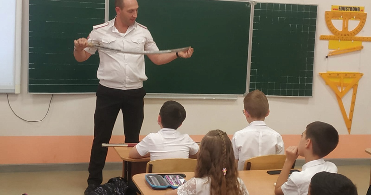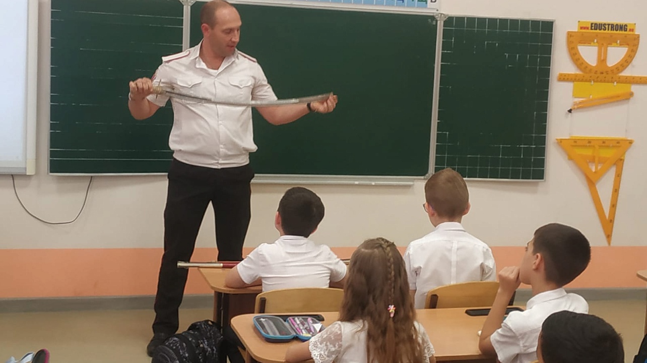 Сегодня казак-наставник Екатеринодарского районного казачьего общества Алексей Томилин провёл урок в 3 «Е» классе МБОУ СОШ №102 города Краснодара на тему «Оружие Кубанских казаков».