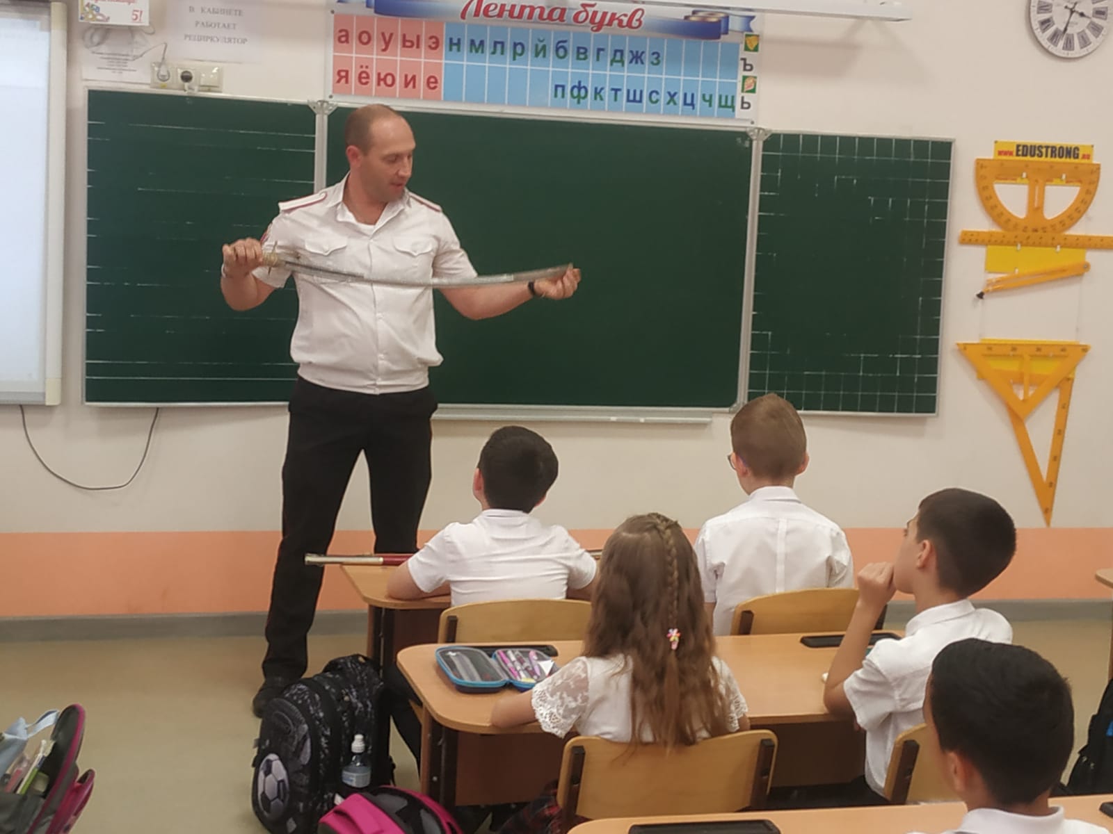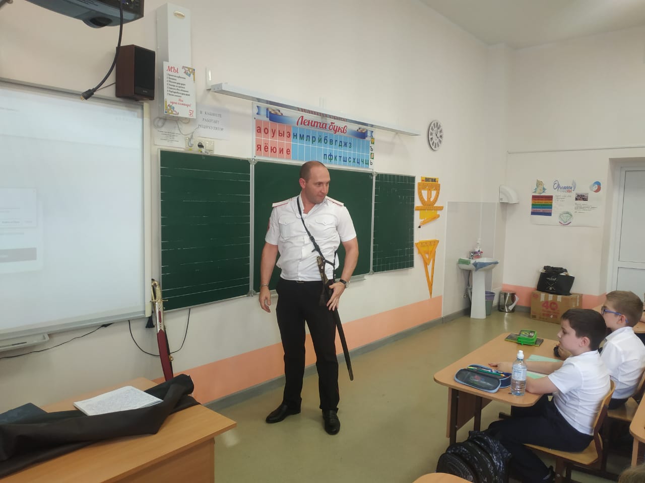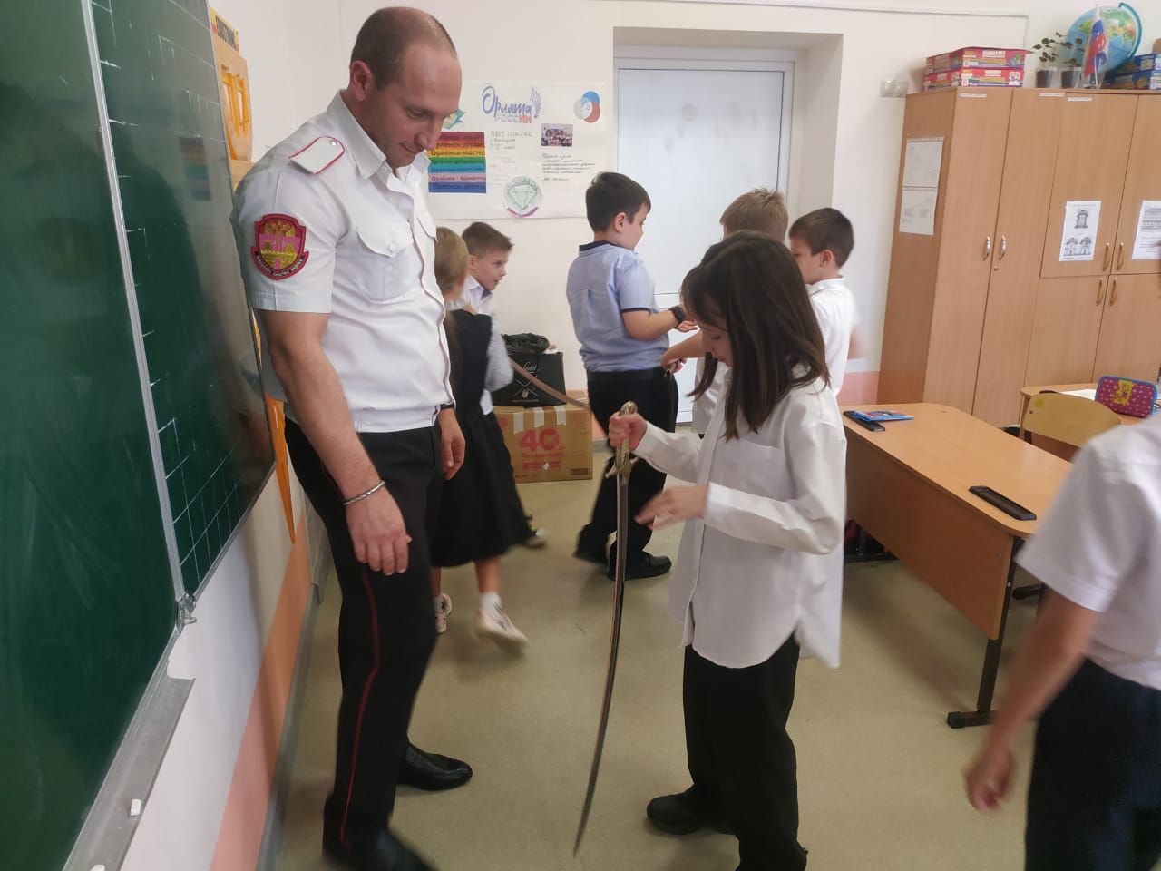 Сегодня казак-наставник Екатеринодарского районного казачьего общества Алексей Томилин провёл урок в 3 «Е» классе МБОУ СОШ №102 города Краснодара на тему «Оружие Кубанских казаков».