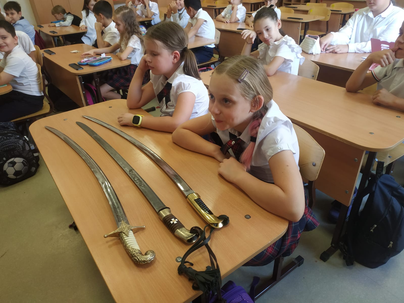 Наставник продемонстрировал ребятам макеты шашек и сабель, которыми орудовали казаки сотни лет назад. Рассказал о преимуществах казачьей шашки, а также показал как казаки носили оружие. В конце урока все желающие смогли потрогать макеты оружия.