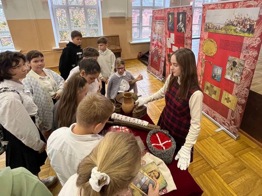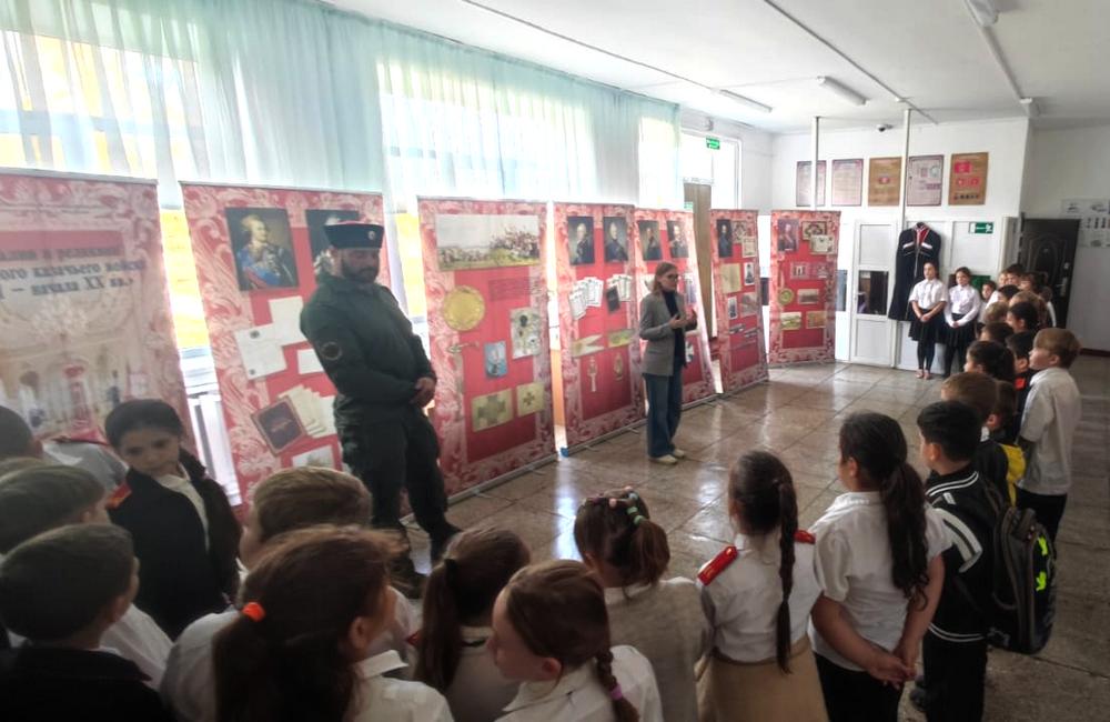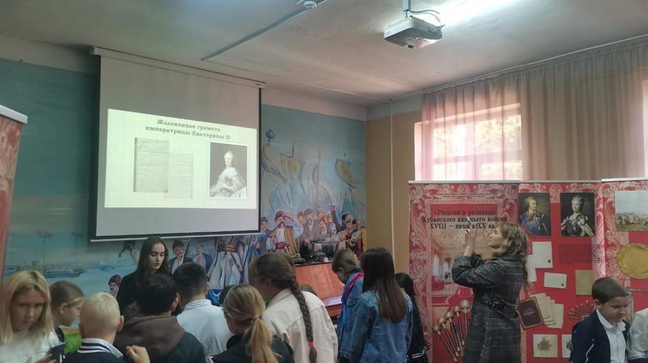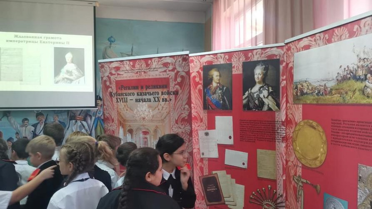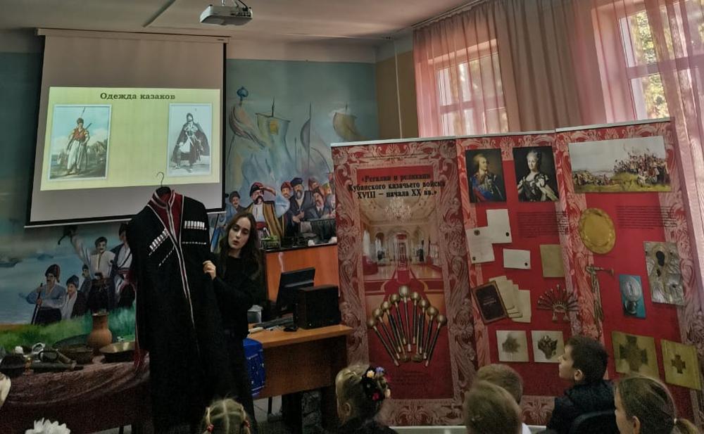 Научные сотрудники музея провели экскурсии по передвижной выставке «Регалии и реликвии Кубанского казачьего войска», рассказали ребятам о культурных и бытовых особенностях кубанских казаков.