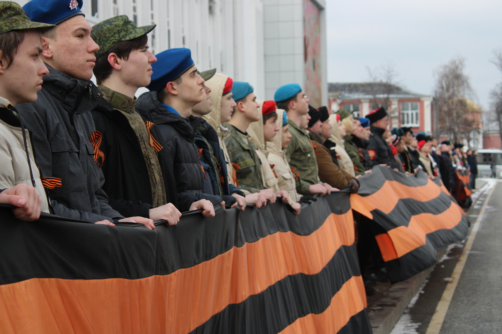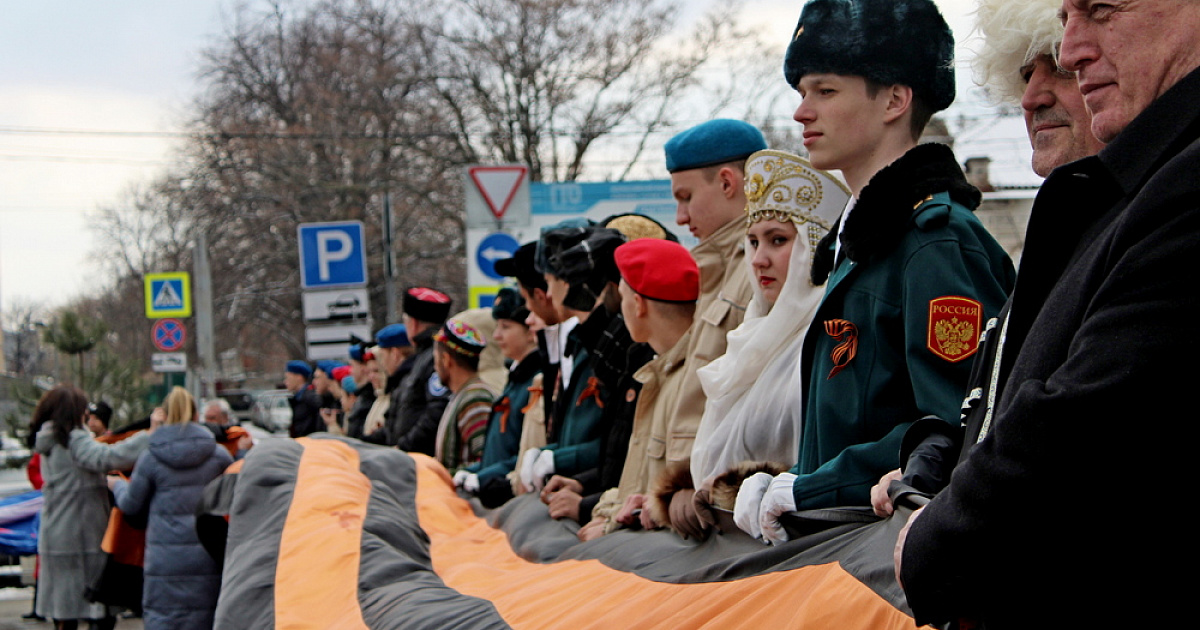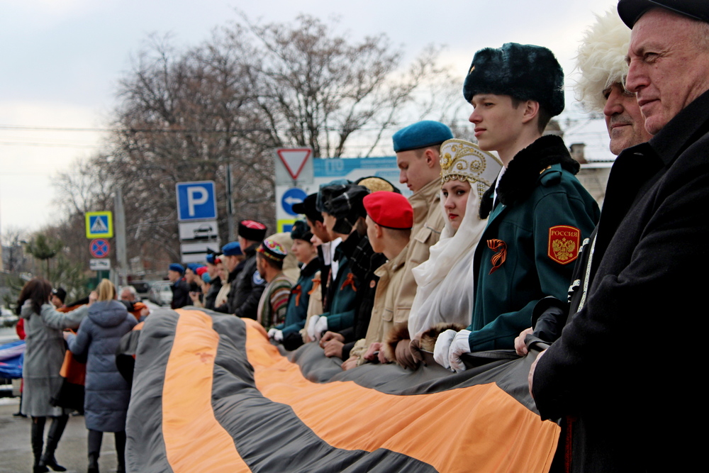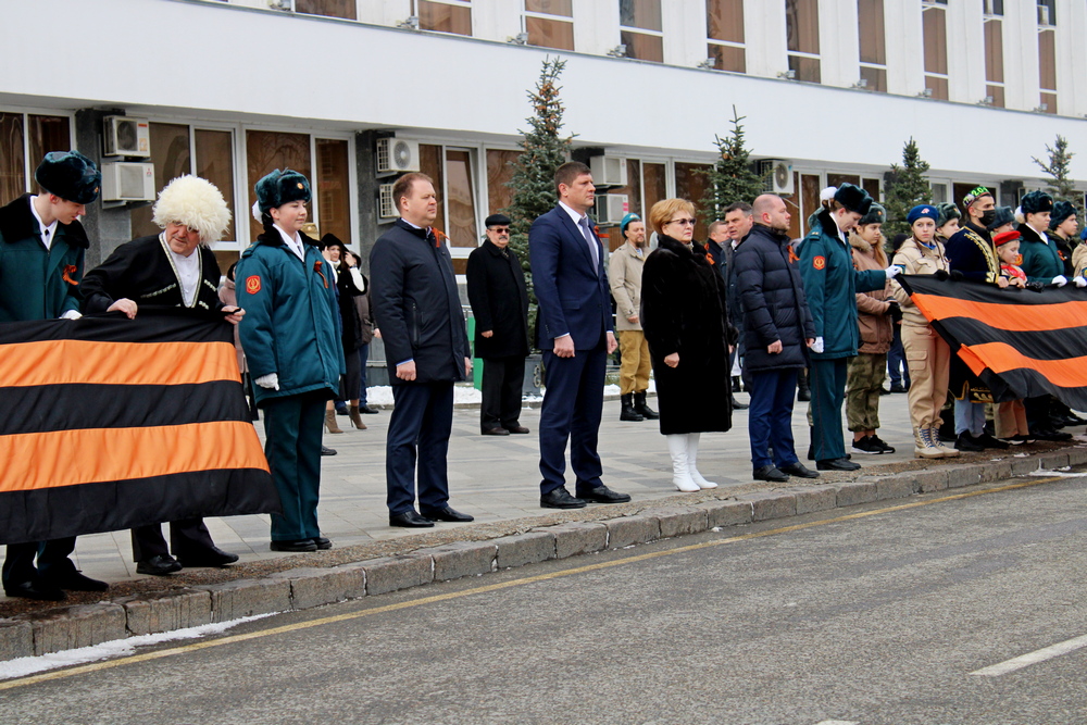 Флаг подняли казаки почётного караула Кубанского казачьего войска под гимн Российской Федерации. Также на площади представители общественных организаций развернули две Георгиевские ленты, протяженность каждой — 15 метров.