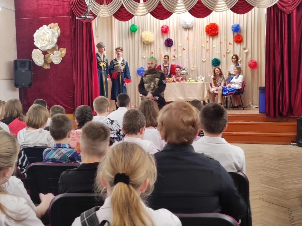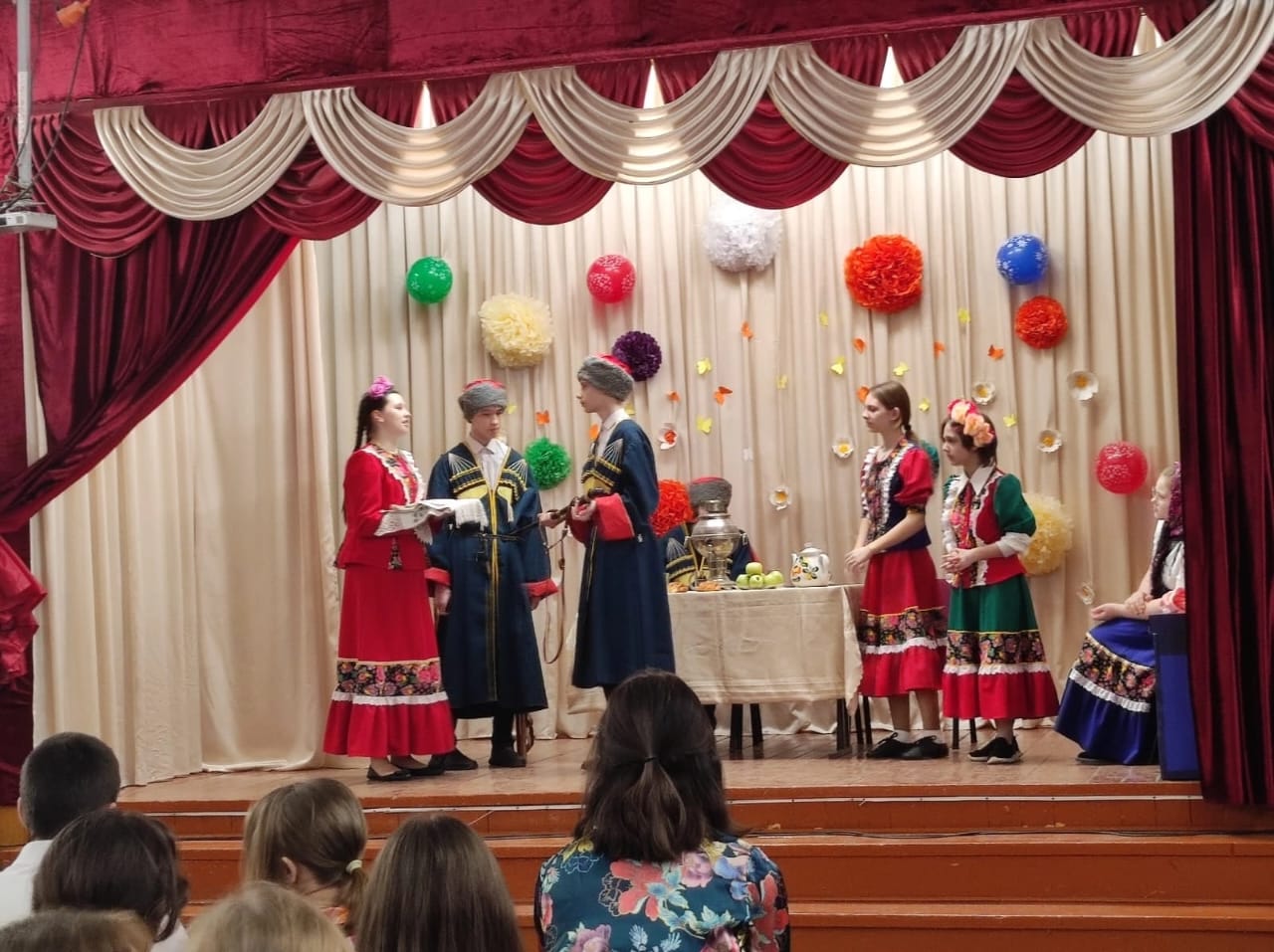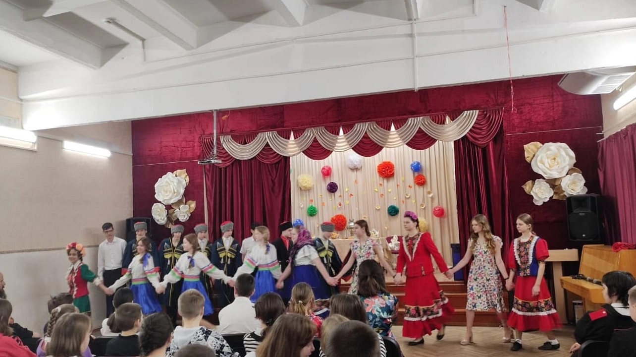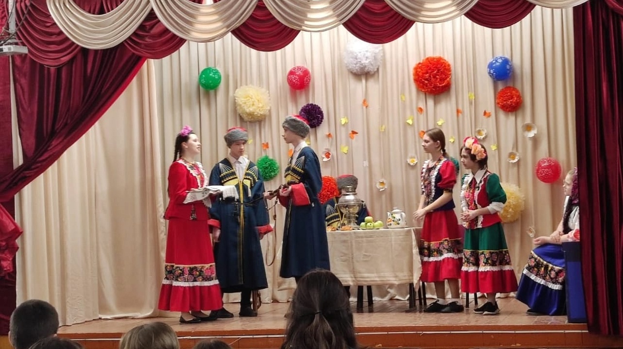 Учащиеся школьного театра показали один из казачьих обрядов "Проводы казака в армию", напомнили казачьи заповеди. Каждый из артистов школьного театра представил образ своего героя ярко и выразительно. Театрализованное представление произвело на зрителей сильное, незабываемое впечатление.