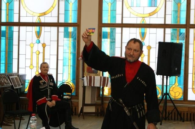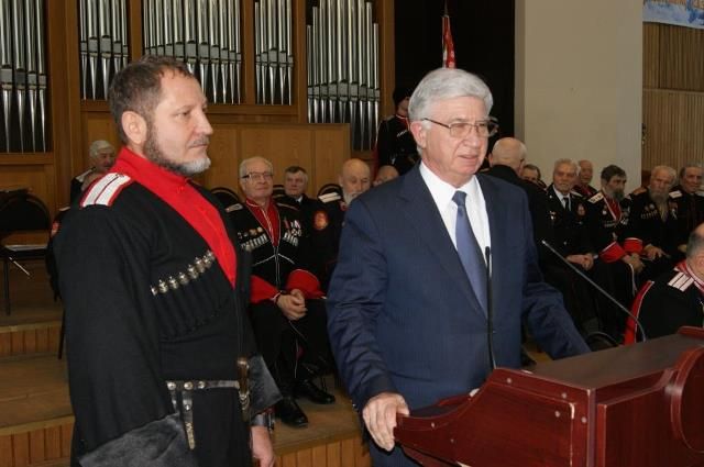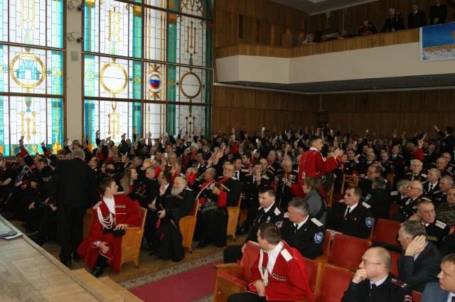 На сцене рядом со знаменем по традиции расположились старики, в президиуме - начальство и почетные гости, среди них первый заместитель атамана Кубанского казачьего войска казачий полковник Николай Перваков; атаман Екатеринодарского отдела ККВ Виктор Светличный; духовник Екатеринодарского районного казачьего общества отец Николай; глава города Владимир Евланов и первый заместитель председателя городской Думы Виктор Тимофеев.