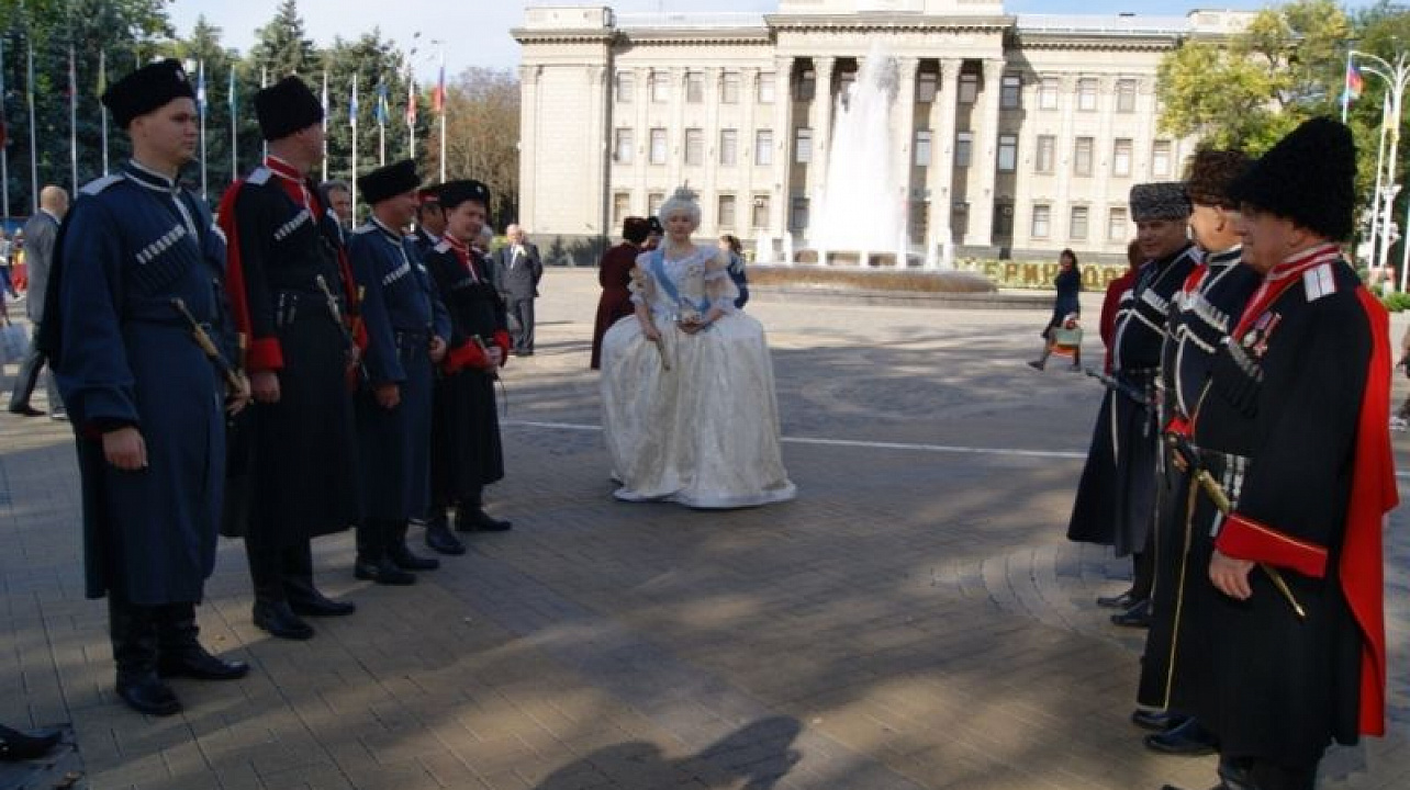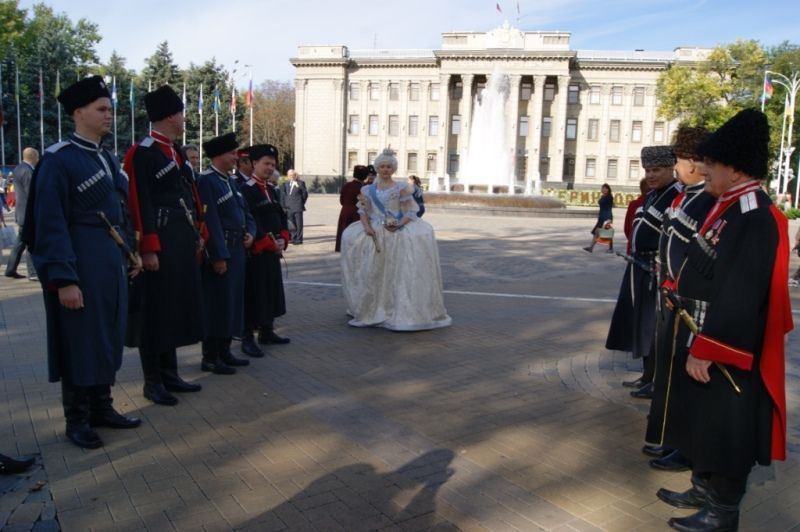 Глава города Владимир Евланов и казаки Екатеринодарского районного казачьего общества встретили иностранных гостей, после чего перед памятником основательницы казачьего града -Екатерине Великой состоялся концерт, на котором выступили творческие коллективы города.