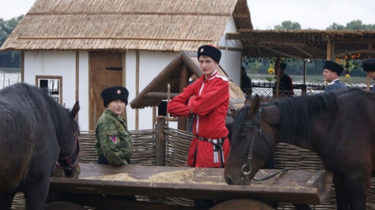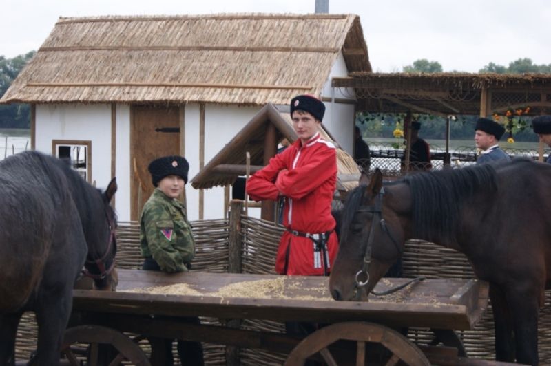Рядом со сценой фестиваля, казаки Екатеринодарского районного казачьего общества на берегу Кубани организовали казачье подворье и курень.