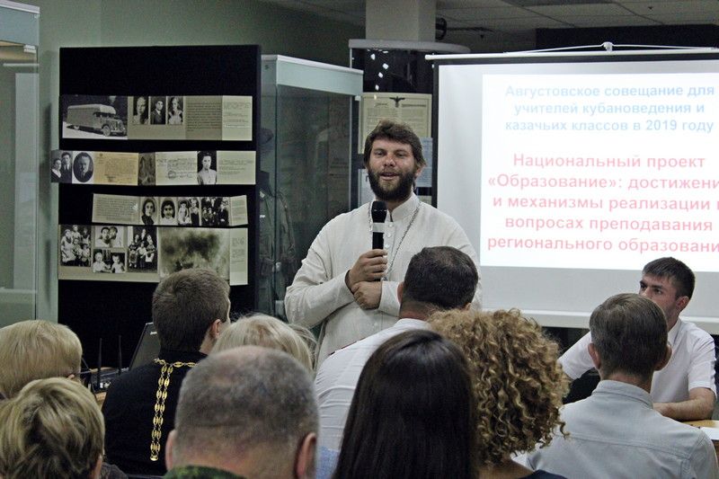 Продолжил совещание штатный священник Свято-Сергиевского храма г.Краснодара протоиерей Иоанн Воронов . Он рассказал о развитии взаимодействия педагогов казачьих школ и классов с приходами и духовенством РПЦ, а также духовно-нравственном воспитание в классах и группах казачьей направленности и на уроках кубановедения. Важной вехой в развитии взаимодействия школ и церкви стала недавняя разработка и утверждение муниципального положения о трёхстороннем договоре и сотрудничестве «Школа-приход-казачье общество». Это решение назревало давно и поможет решить проблему наставничества и религиозного просвещения в рамках учебного процесса, там, где в этом есть необходимость и потребность школ, особенно в контексте одного из обязательных модулей в 1-11 классах казачьей направленности – «Основы православной культуры», а также курса «Духовные истоки Кубани». Протоиерей Иоанн пожелал крепости духа и терпения педагогам на их нелёгком и ответственном поприще в новом учебном году.