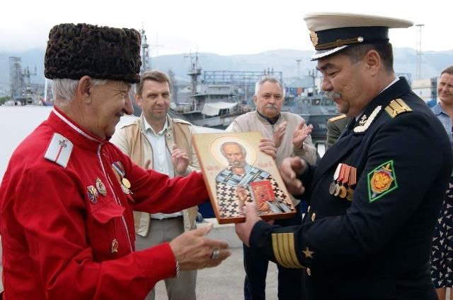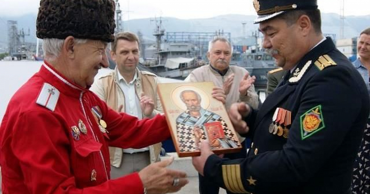 Председатель Совета стариков Екатеринодарского РКО есаул Александр Чуркин поздравил экипаж пограничников, и, пожелав им божьей помощи в служении Отечеству, подарил икону Святого Николая Чудотворца, который считается покровителем всех моряков.