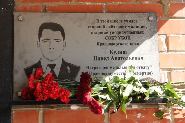 В поселке Белозерный города Краснодар у центрального крыльца школы №77 увековечили память ветерана службы по борьбе с организованной преступностью Павлу Анатольевичу Кулишу, трагически погибшему во время командировки на территории Чеченской республики.