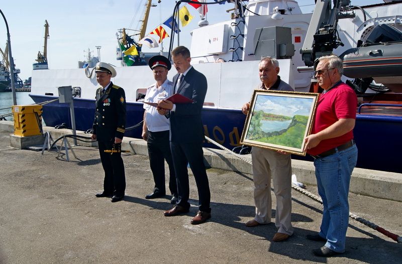 Заместитель главы администрации Карасунского округа Краснодара Роман Мишенин зачитал пограничникам приветственный адрес, вручив экипажу корабля картину с изображением пейзажа Карасунского округа.