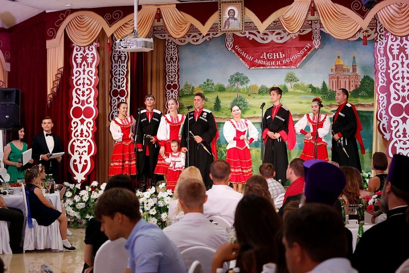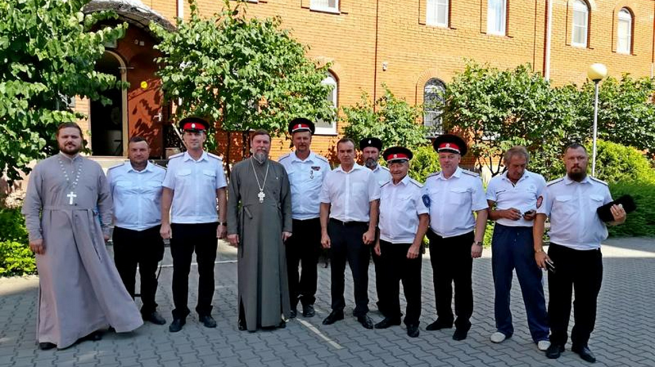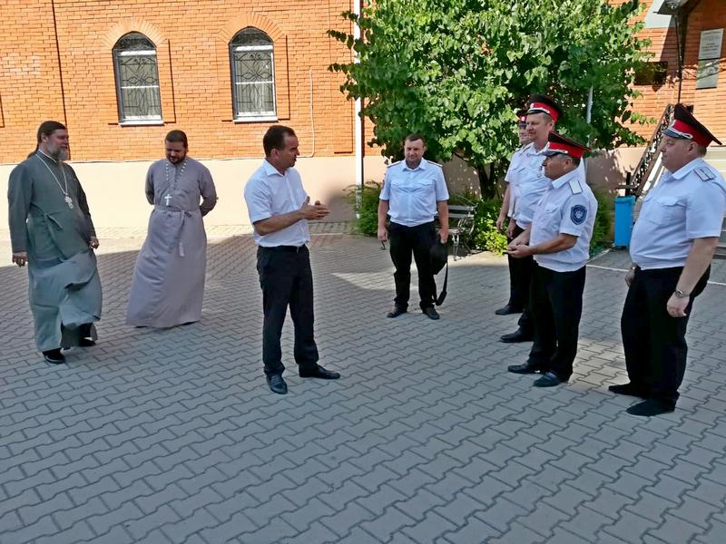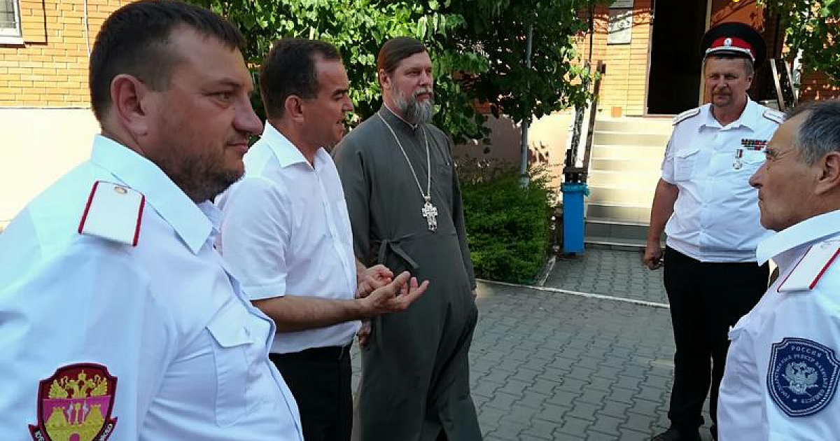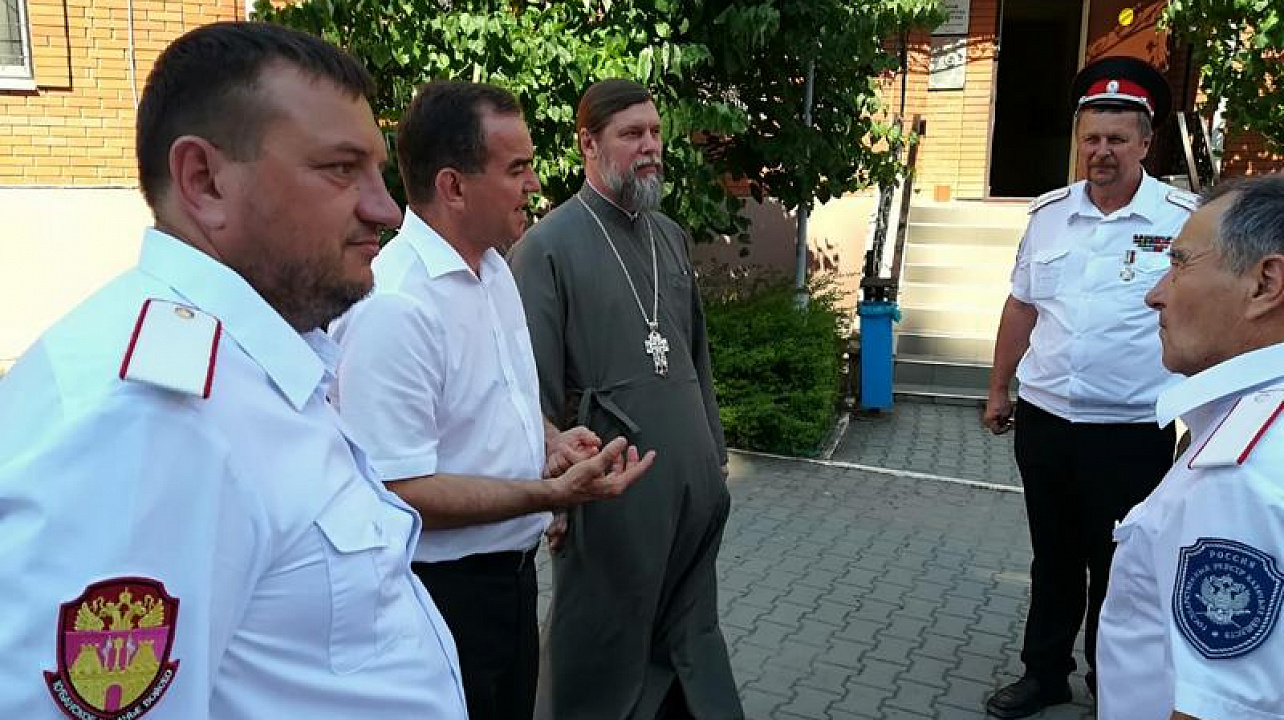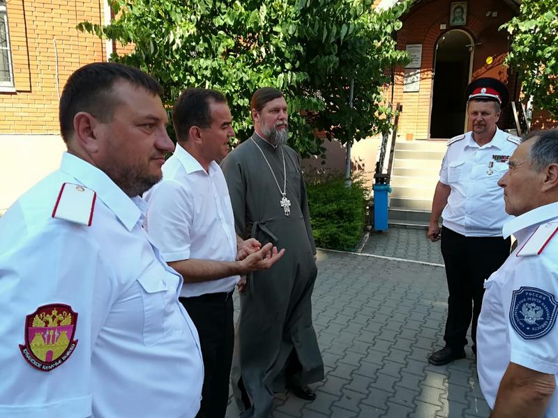 Почетных гостей встречали и сопровождали на протяжении всего визита казаки Екатеринодарского районного казачьего общества из хуторского казачьего общества «им. атамана В.Величко». Перед началом мероприятия Вениамин Иванович пообщался с казаками и поздравил с Днём Семьи, Любви и Верности.