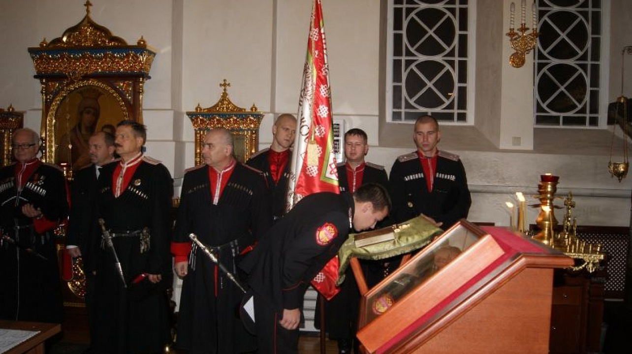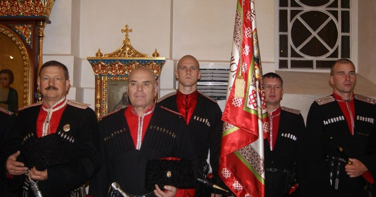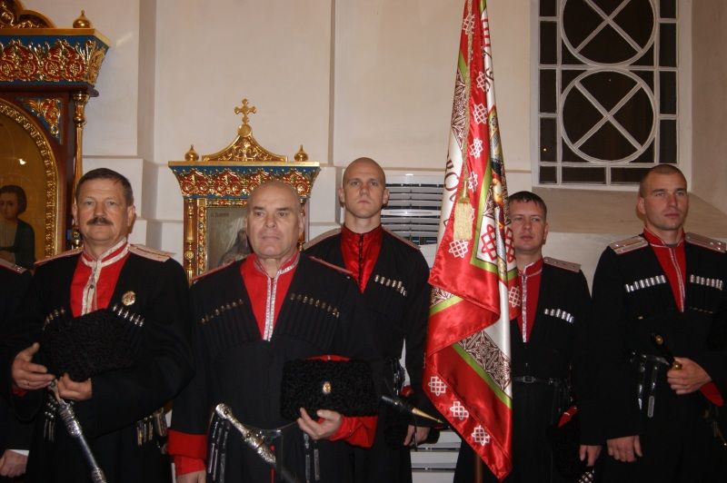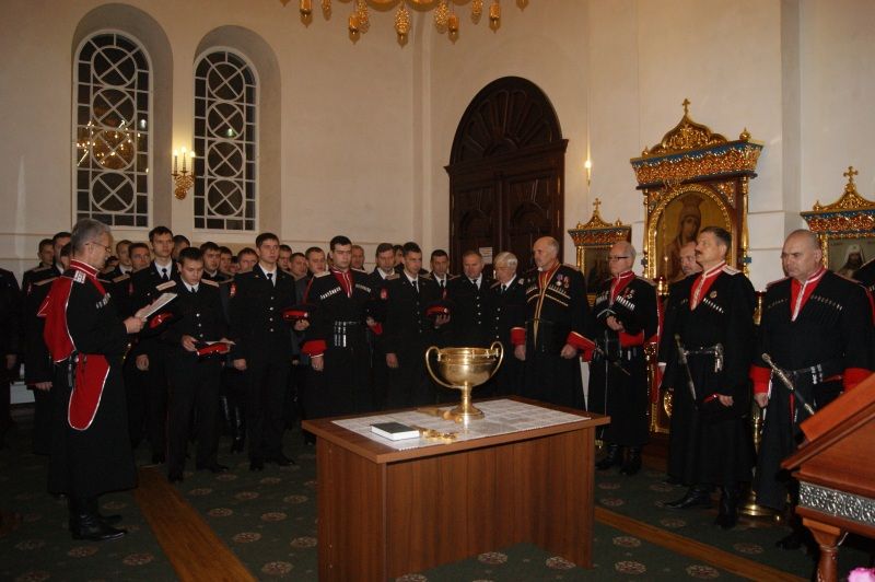Более 30 казаков собрались в Сергиевском пределе собора для участия в торжественной церемонии. После краткого молебна казаки зачитали текст присяги, поцеловали крест и Знамя Екатеринодарского районного общества.