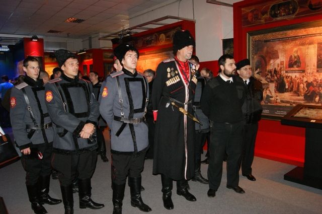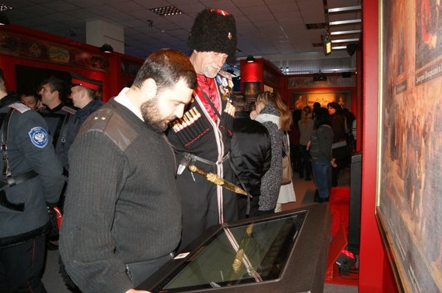 Казаки Екатеринодарского районного казачьего общества с большим интересом посетили выставку, особенно казаков заинтересовала история династии Романовых.