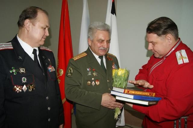 Есаул Юрий Шмельков поздравил руководителя Выставочного зала Дмитрия Родина, вручив комплект подарочных изданий, посвящённых истории Кубанского казачества.