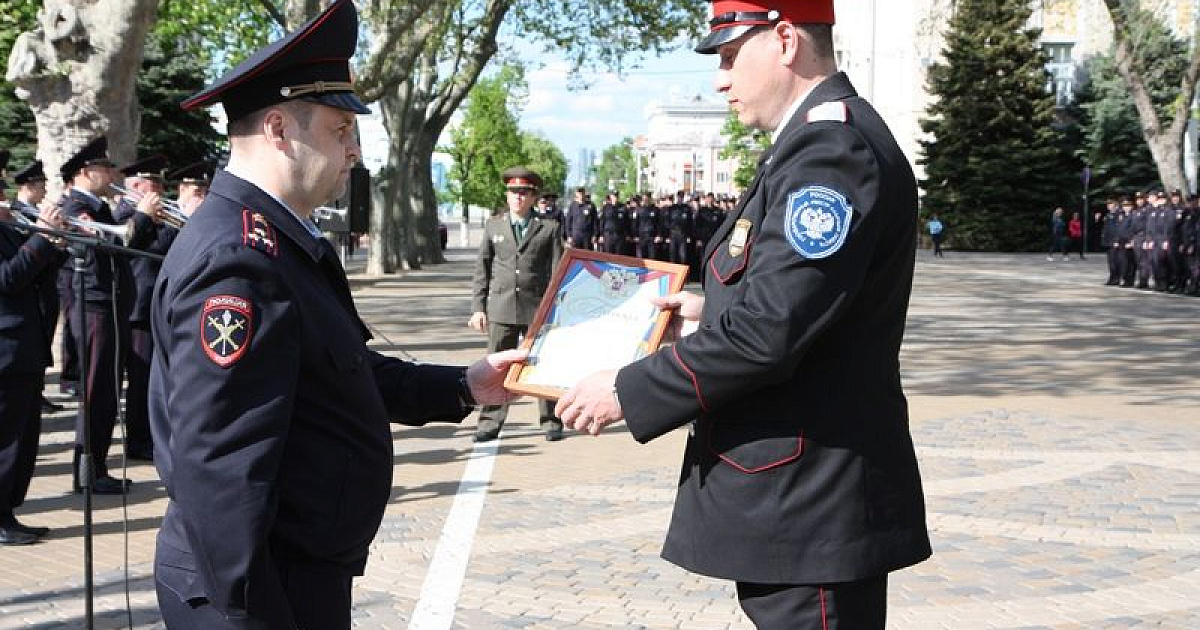 Начальник управления МВД России по городу Краснодару полковник полиции Дмитрий Остапенко вручил грамоты казакам-дружинникам Андрею Лукьяненко и Сергею Козлову за личный вклад в обеспечение охраны общественного порядка на территории города Краснодара.