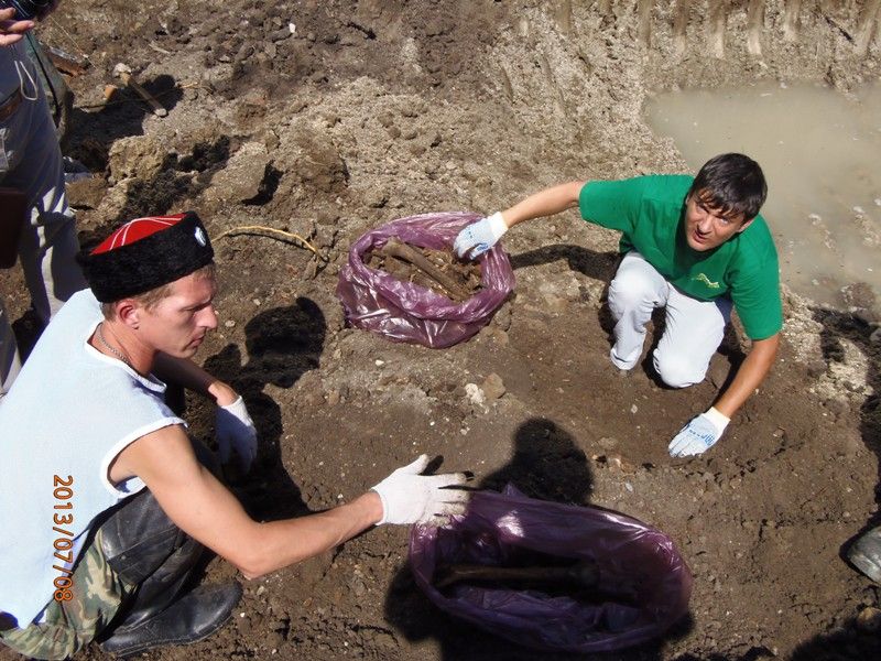 На глубине одного метра от поверхности земли были обнаружены многочисленные останки человеческих тел. Строительные работы были немедленно приостановлены и на место происшествия приглашен поисковый отряд Краснодарской краевой общественно научно – поисковой организации “Щит и меч”, возглавляемый старшим психологом отряда особого назначения “Акула” капитаном внутренней службы, сотником, заместителем атамана по работе с молодежью станичного казачьего общества “Елизаветин Курень”- Корецким Алексеем Владимировичем.