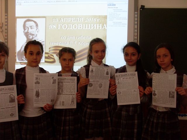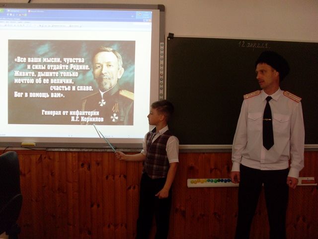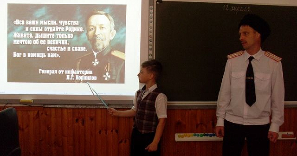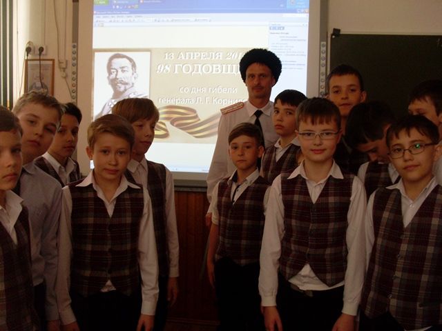 В школе №6 города Краснодара прошёл классный час, посвящённый памяти главнокомандующего Добровольческой армии генерала от инфантерии Лавра Георгиевича Корнилова. Помощник атамана Екатеринодарского районного казачьего общества войсковой старшина Олег Малёванный рассказал казачатам 4 «А» класса о жизни и судьбе знаменитого военачальника, показав редкие фотографии и карты «Ледового похода».