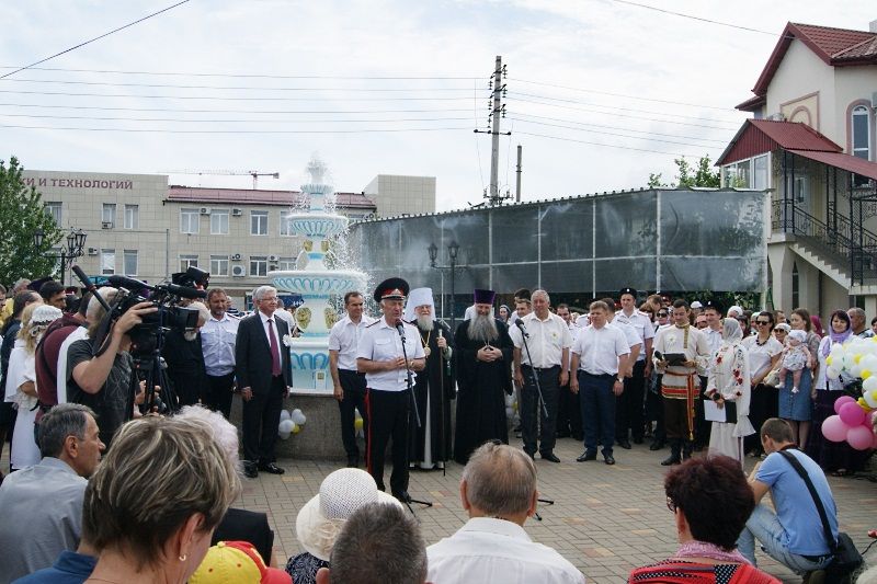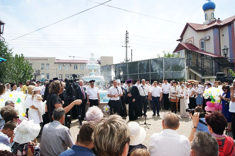 После богослужения началась официальная часть праздника, у храмового фонтана собрались руководители края, города, Кубанского казачьего войска, семейные пары юбиляры, казачество прихожане храма и жители города.