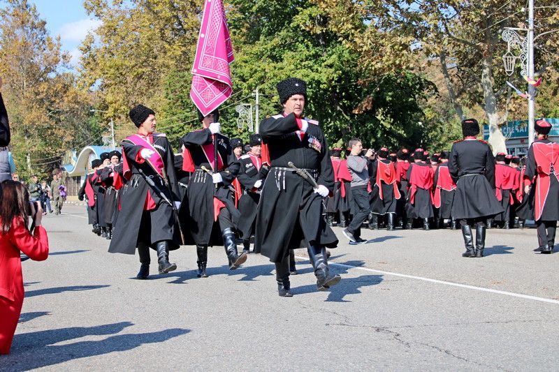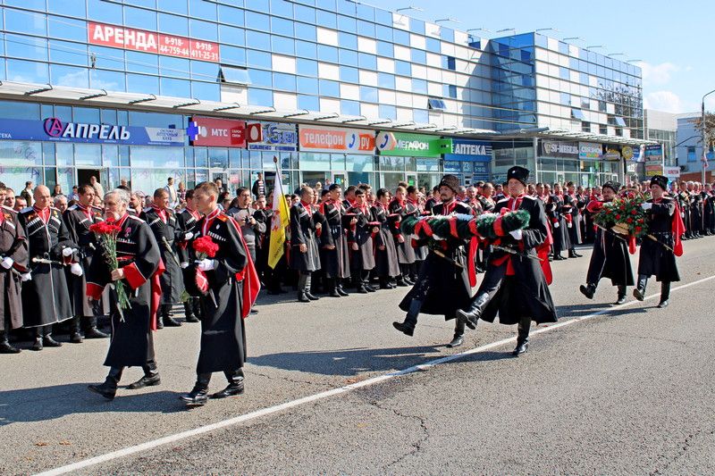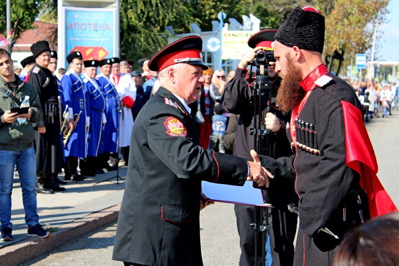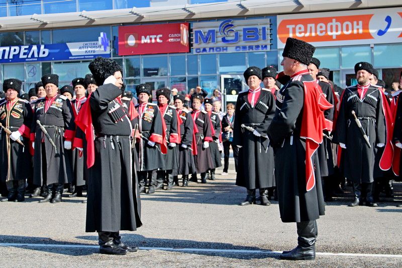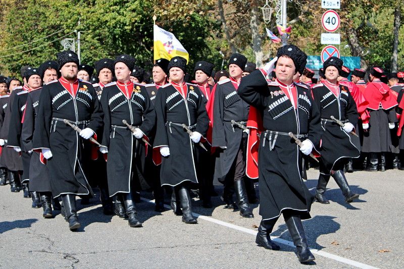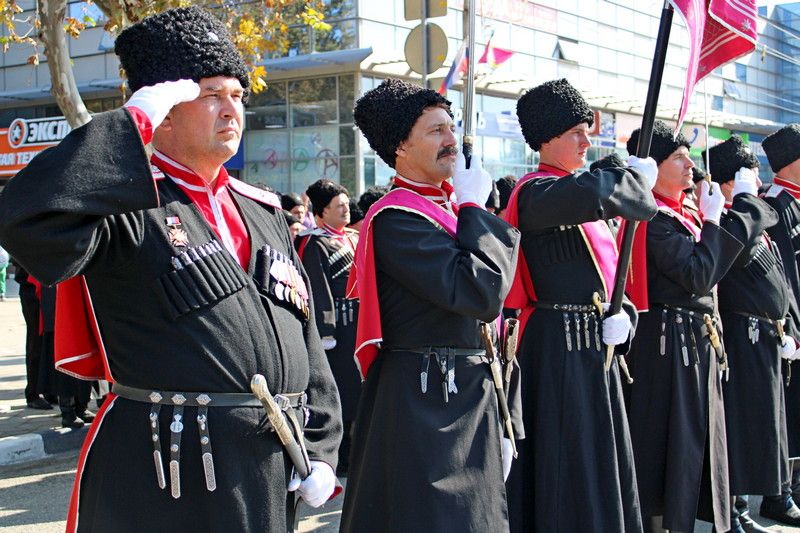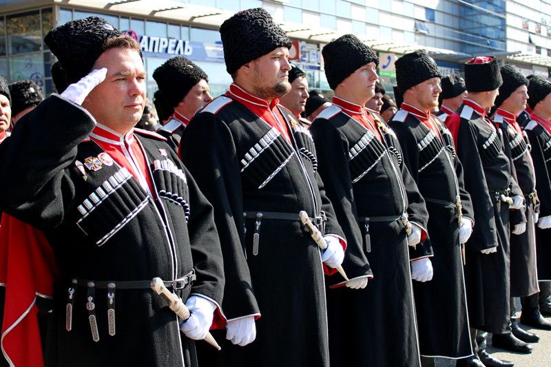 В 11:00 начался парад казачьих сотен Екатеринодарского отдела Кубанского казачьего войска. Руководил им атаман Екатеринодарского отдела Виктор Светличный. В торжественном мероприятии также принял участие первый заместитель атамана Кубанского казачьего войска, казачий полковник Николай Перваков.