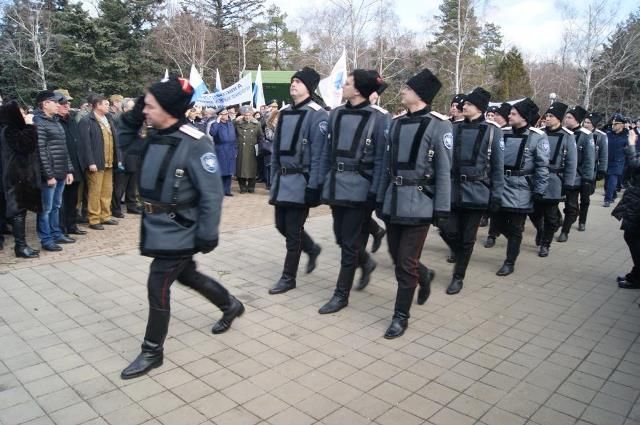 После оружейного залпа казаки и военнослужащие Краснодарского гарнизона прошли торжественным маршем.