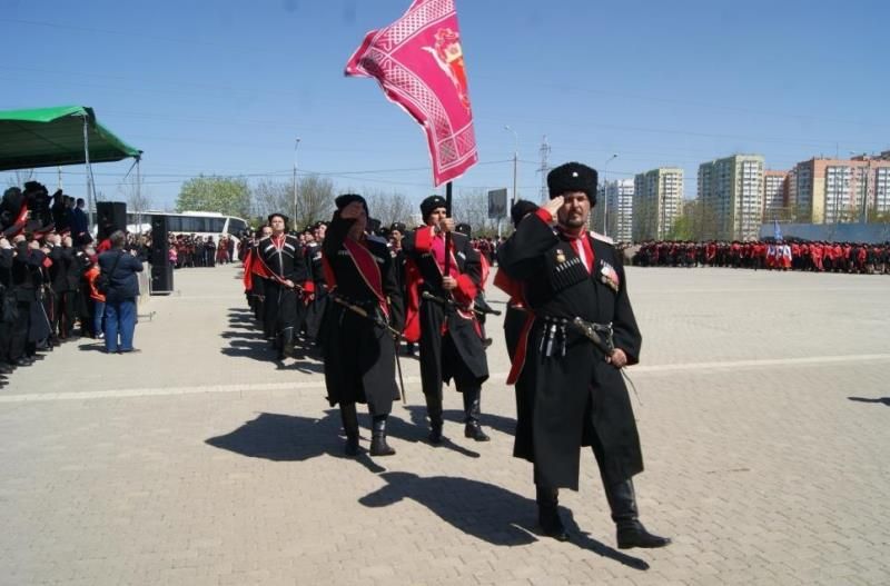 Казалось, и яблоку негде было упасть: площадка сплошь была заполнена казаками в красно-черной особо парадной форме, выстроившимися в коробки парадных расчетов Екатеринодарского отдела.