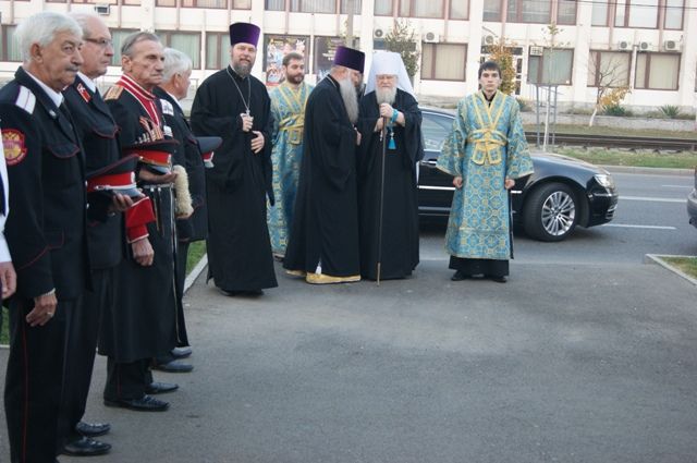 По сложившейся традиции казаки встретили Владыку перед началом службы в храме.