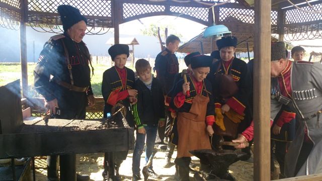 На территории комплекса казаки установили настоящую Кубанскую печь, наковальню и коновязь. Казаки показали юным казачатам ансамбля «Стригунок» особенности казачьего быта, а так же навыки кузнечного дела и мастерство верховой езды.