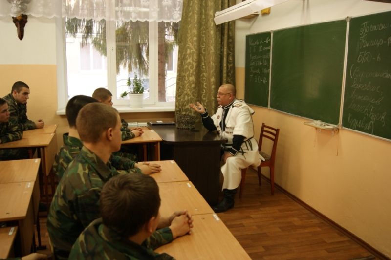 В ходе встречи атаман куреня провел занятие с кадетами старших классов, в ходе которого рассказал о подготовке современного казака к службе в Вооруженных силах, о воинских частях в которых проходят службу казаки Екатеринодарского районного казачьего общества, особенно заинтересовала будущих защитников Отечества возможность проходить службу в Президентском полку.