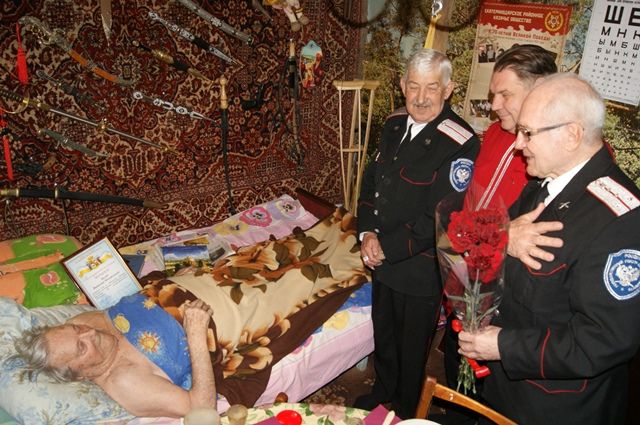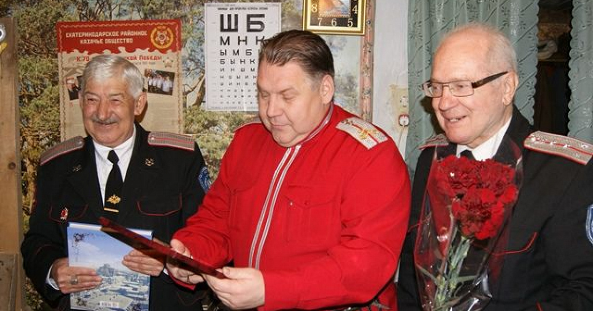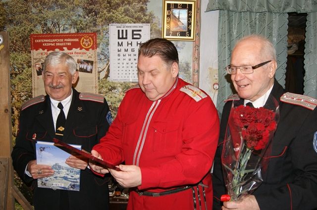 Председатель Совета стариков Екатеринодарского РКО есаул Александр Чуркин, член Совета стариков подъесаул Александр Борщёв и заместитель атамана Екатеринодарского РКО есаул Юрий Шмельков вручили ветерану цветы, благодарственные письма от городского атамана и Совета ветеранов, а так же книгу и ценные подарки.